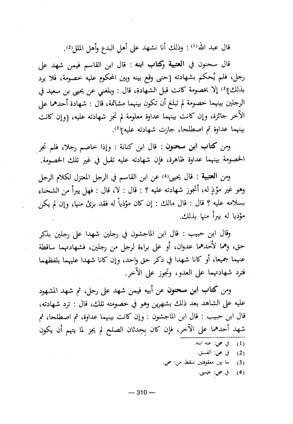 وقال ابن حبيب: قال ابن الماجشون في رجلين شهدا على رجلين بذكر حق، وهما لأحدهما عدوان، أو على براءة لرجل من رجلين، فشهادتهما ساقطة عنهما جميعا، أو كانا شهدا في ذكر حق واحد، وإن كانا شهدا عليهما بلفظهما فترد شهادتهما على العدو، وتجوز على الآخر.