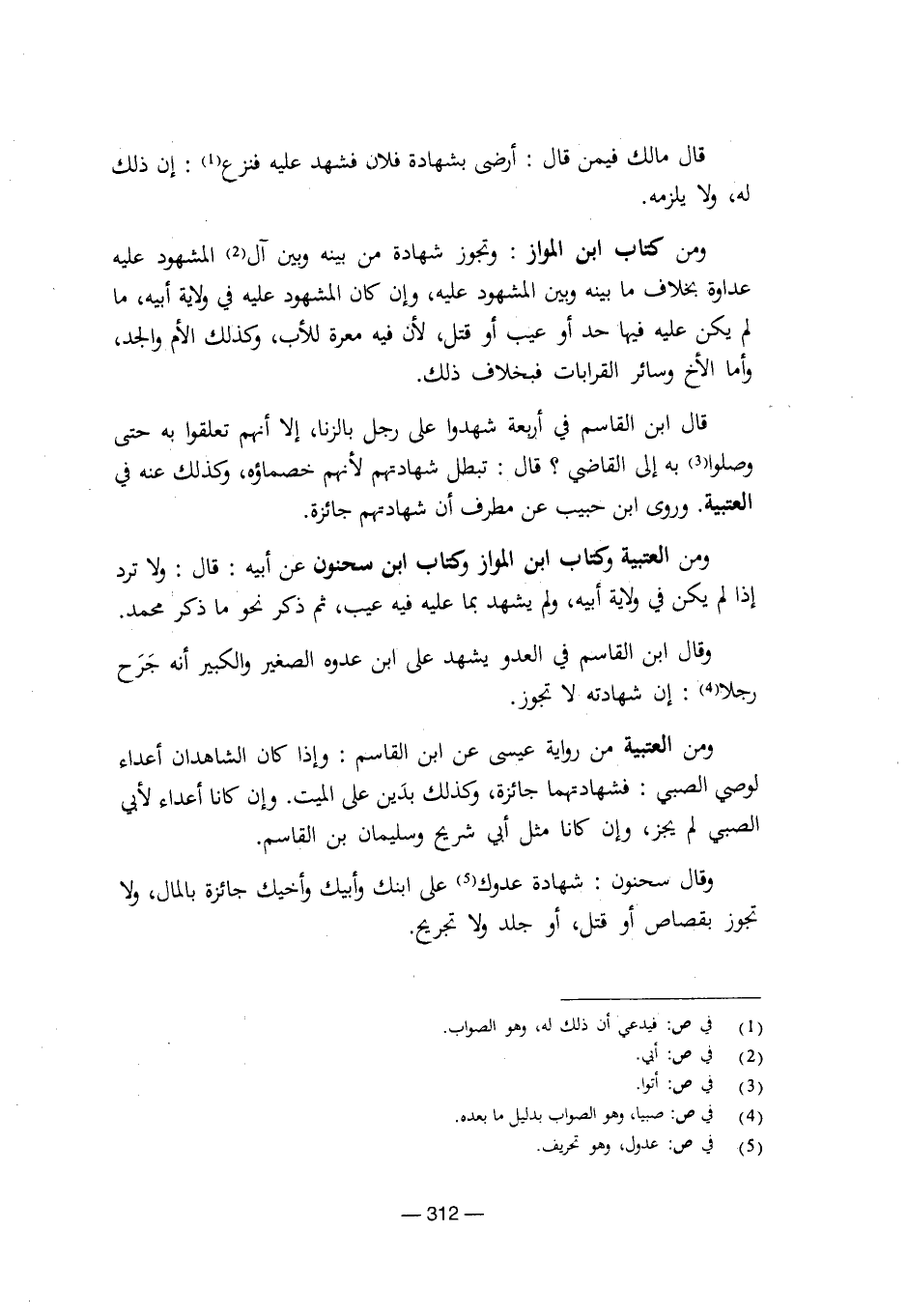 وقال سحنون: شهادة عدوك على ابنك وأبيك وأخيك جائزة بالمال، ولا تجوز بقصاص أو قتل، أو جلد ولا تجريح. [8/ 312]