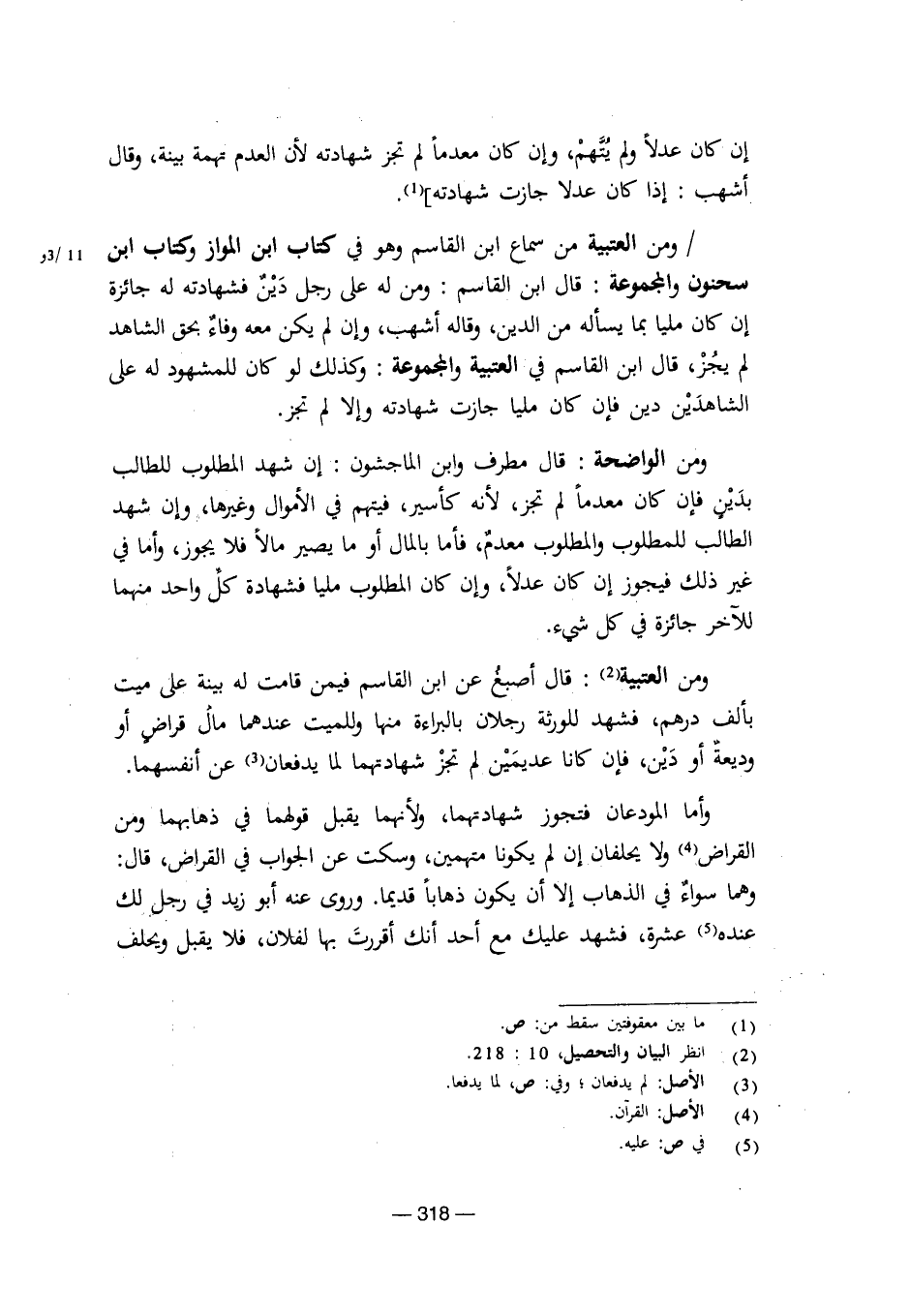 /ومن العتبية من سماع ابن القاسم وهو في كتاب ابن المواز وكتاب ابن سحنون والمجموعة: قال ابن القاسم: ومن له على رجل دين فشهادته له جائزة إن كان مليا بما يسأله من الدين، وقاله أشهب، وإن لم يكن معه وفاء بحق الشاهد لم يجز، قال ابن القاسم في العتبية والمجموعة: وكذلك لو كان للمشهود له على الشاهدين دين فإن كان مليا جازت شهادته وإلا لم تجز.