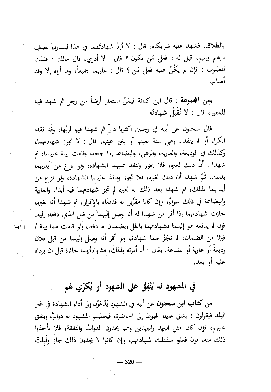 من كتاب ابن سحنون عن أبيه في الشهود يدعون إلى أداء الشهادة في غير البلد فيقولون: يشق علينا الهبوط إلى الحاضرة، فيعطيهم المشهود له دواب وينفق عليهم، فإن كان مثل البريد والبريدين وهم يجدون الدواب والنفقة، فلا يأخذوا ذلك منه، فإن فعلوا سقطت شهادتهم، وإن كانوا لا يجدون ذلك جاز وقبلت [8/ 320]