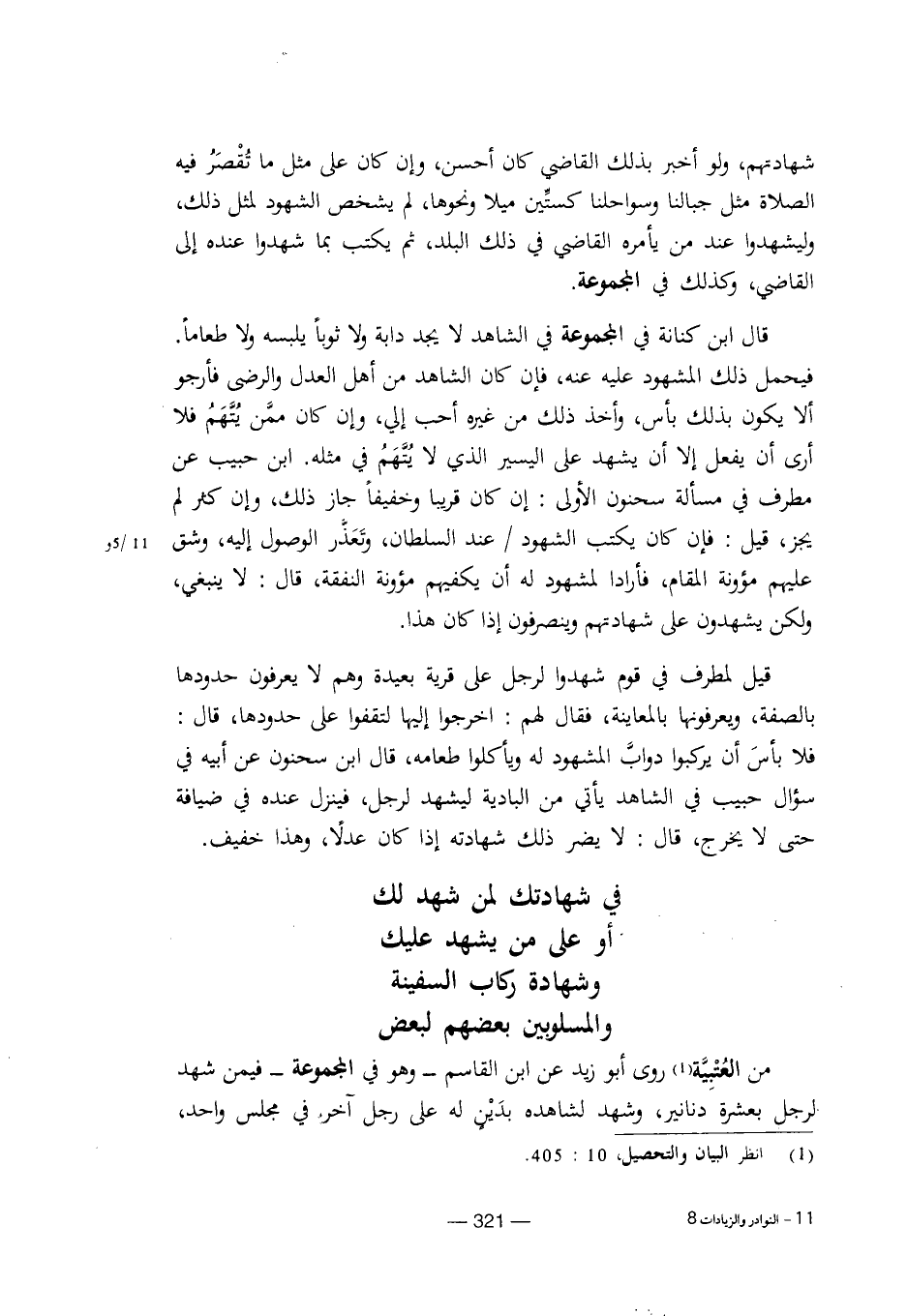 من العتبية روى أبو زيد عن ابن القاسم- وهو في المجموعة – فيمن شهد لرجل بعشرة دنانير، وشهد لشاهده بدين له على رجل آخر. في مجلس واحد، [8/ 321]