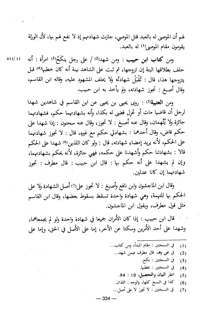 قال ابن حبيب: إذا كان الأمران جميعا في شهادة واحدة ولو لم يجمعاهما، وشهدا على أحد الأمرين وسكتا عن الآخر، إما على الأصل في الحق، وإما على [8/ 334]