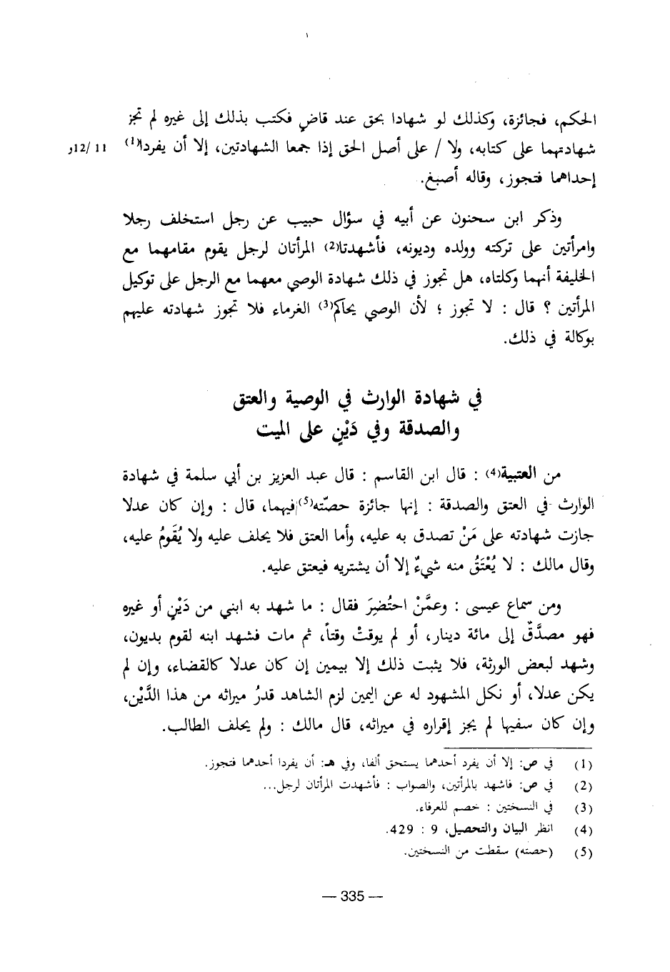 من العتبية: قال ابن القاسم: قال عبد العزيز بن أبي سلمة في شهادة الوارث في العتق والصدقة: إنها جائزة حصته فيهما، قال: وإن كان عدلا جازت شهادته على من تصدق به عليه، وأما العتق فلا يحلف عليه ولا يقوم عليه، وقال مالك: لا يعتق منه شيء إلا أن يشتريه فيعتق عليه.