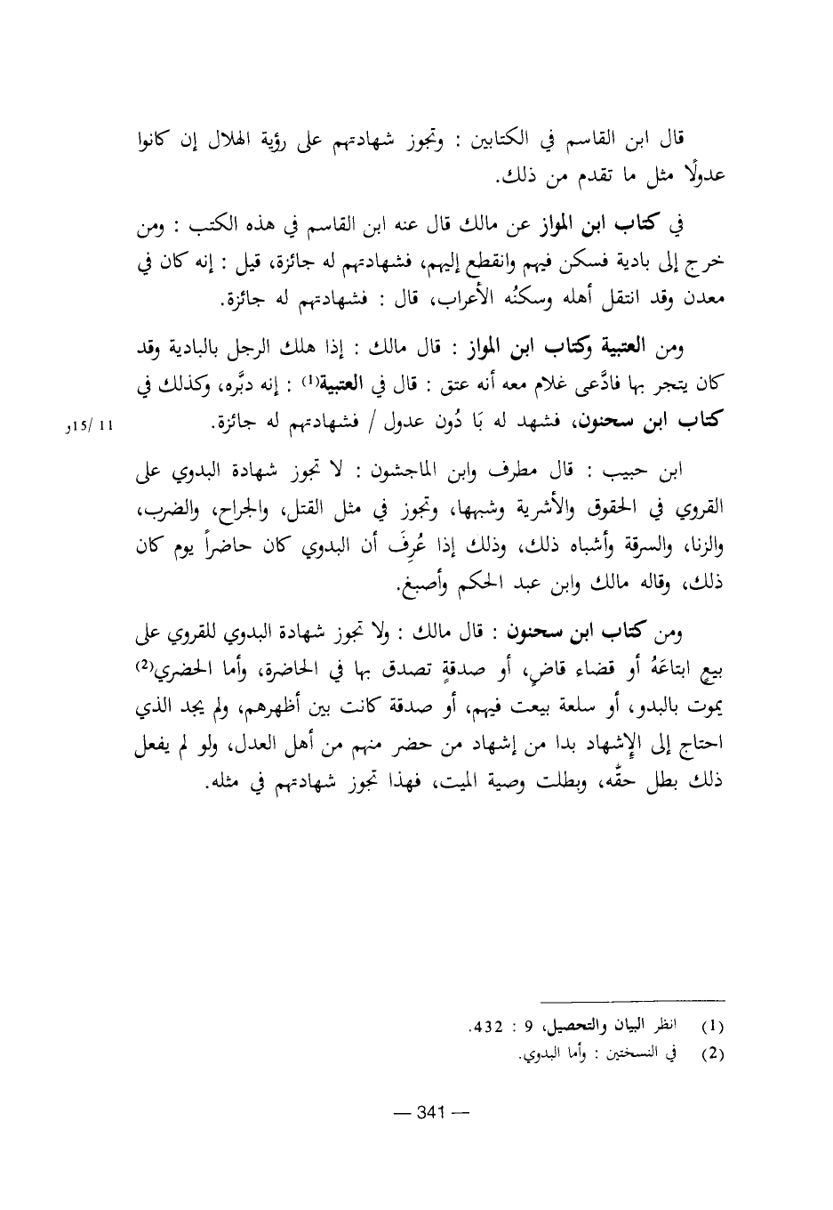 ابن حبيب: قال مطرف وابن الماجشون: لا تجوز شهادة البدوي على القروي في الحقوق والأشرية وشبهها، وتجوز في مثل القتل، والجراح، والضرب، والزنا، والسرقة وأشباه ذلك، وذلك إذا عرف أن البدوي كان حاضرا يوم كان ذلك، وقاله مالك وابن عبد الحكم وأصبغ.