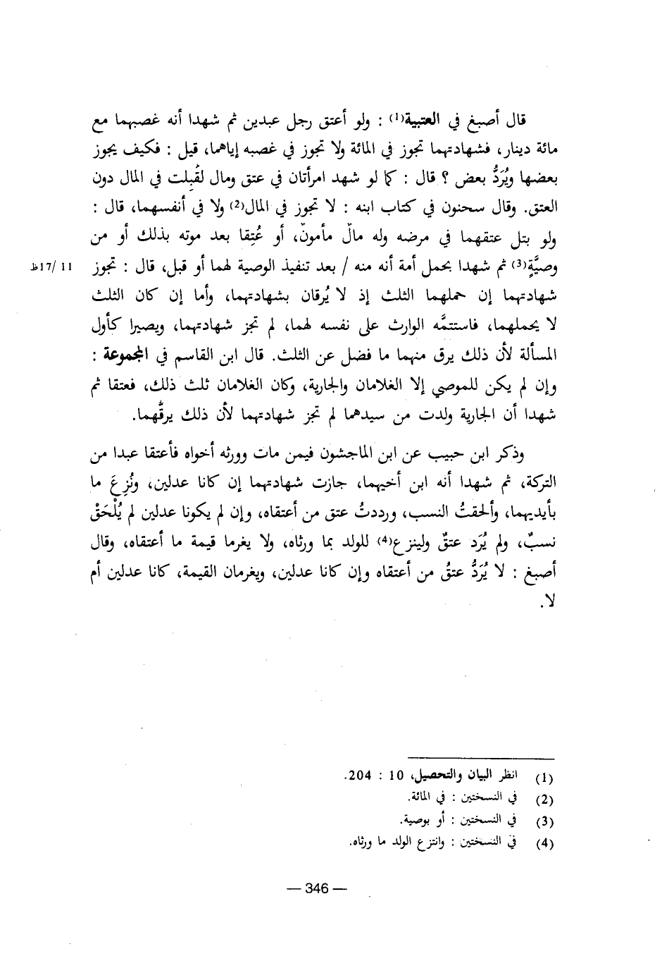 قال أصبغ في العتبية: ولو أعتق رجل عبدين ثم شهدا أنه غصبهما مع مائة دينار، فشهادتهما تجوز في المائة ولا تجوز في غصبه إياهما، وقيل: فكيف يجوز بعضهما ويرد بعض؟ قال: كما لو شهد امرأتان في عتق ومال لقبلت في المال دون العتق. وقال سحنون في كتاب ابنه: لا تجوز في المال ولا في أنفسهما، قال: ولو بتل عتقهما في مرضه وله مال مأمون، أو عتقها بعد موته بذلك أو من وصية ثم شهدا بحمل أمة أنه منه/ بعد تنفيذ الوصية لهما أو قبل، قال: تجوز شهادتهما إن حملهما الثلث إذ لا يرقان بشهادتهما، وأما إن كان الثلث لا يحملهما، فاستتمه الوارث على نفسه لهما، لم تجز شهادتهما، ويصبرا كأول المسألة لأن ذلك يرق منهما ما فضل عن الثلث. قال ابن القاسم في المجموعة: وإن لم يكن للموصى إلا الغلامان والجارية، وكان الغلامان ثلث ذلك، فعتقا ثم شهدا أن الجارية ولدت من سيدهما لم تجز شهادتهما لأن ذلك يرقهما.