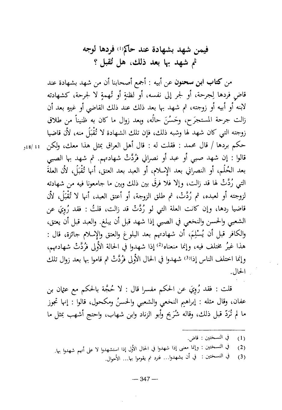 من كتاب ابن سحنون عن أبيه: أجمع أصحابنا أن من شهد بشهادة عند قاض فردها لجرحة، أو لجر إلى نفسه، أو لظنة أو تهمة لا لجرحة، كشهادته لابنه أو أبيه أو زوجته، ثم شهد بها بعد ذلك عند ذلك القاضي أو غيره بعد أن زالت جرحة المستجرح، وحسن حاله، وبعد زوال ما كان به ظنيناً من طلاق زوجته التى كان شهدا لها وشبه ذلك، فإن تلك الشهادة لا تقبل منه، لأن قاضيا حكم بردها/ قال محمد: فقلت له: قال أهل العراق بمثل هذا معك، ولكن قالوا: إن شهد صبي أو عبد أو نصراني فردت شهادتهم. ثم شهد بها الصبي بعد الحلم، أو النصراني بعد الإسلم، أو العبد بعد العتق، أنها تقبل، لأن العلة التى ردت لها قد زالت، وإلا فلا فرق بين ذلك وبين ما جامعونا فيه من شهادته لزوجته أو لعبده، ثم ردت، ثم طلق الزوجة، أو أعتق العبد، أنها لا تقبل، لأن قاضيا ردها، وإن كانت العلة التي لو ردت قد زالت، قلت: فقد روي عن الشعبي والحسن والنخعي في الصبي إذا شهد قبل أن يبلغ. والعبد قبل أن يعتق، والكافر قبل أن يسلم، أن شهادتهم بعد البلوغ والعتق والإسلام جائزة، قال: هذا غير مختلف فيه، وإنما منعناه إذا شهدوا في الحالة الأولى فردت شهادتهم، وإنما اختلف الناس إذا شهدوا في الحال الأولى فردت ثم قاموا بها بعد زوال تلك الحال.