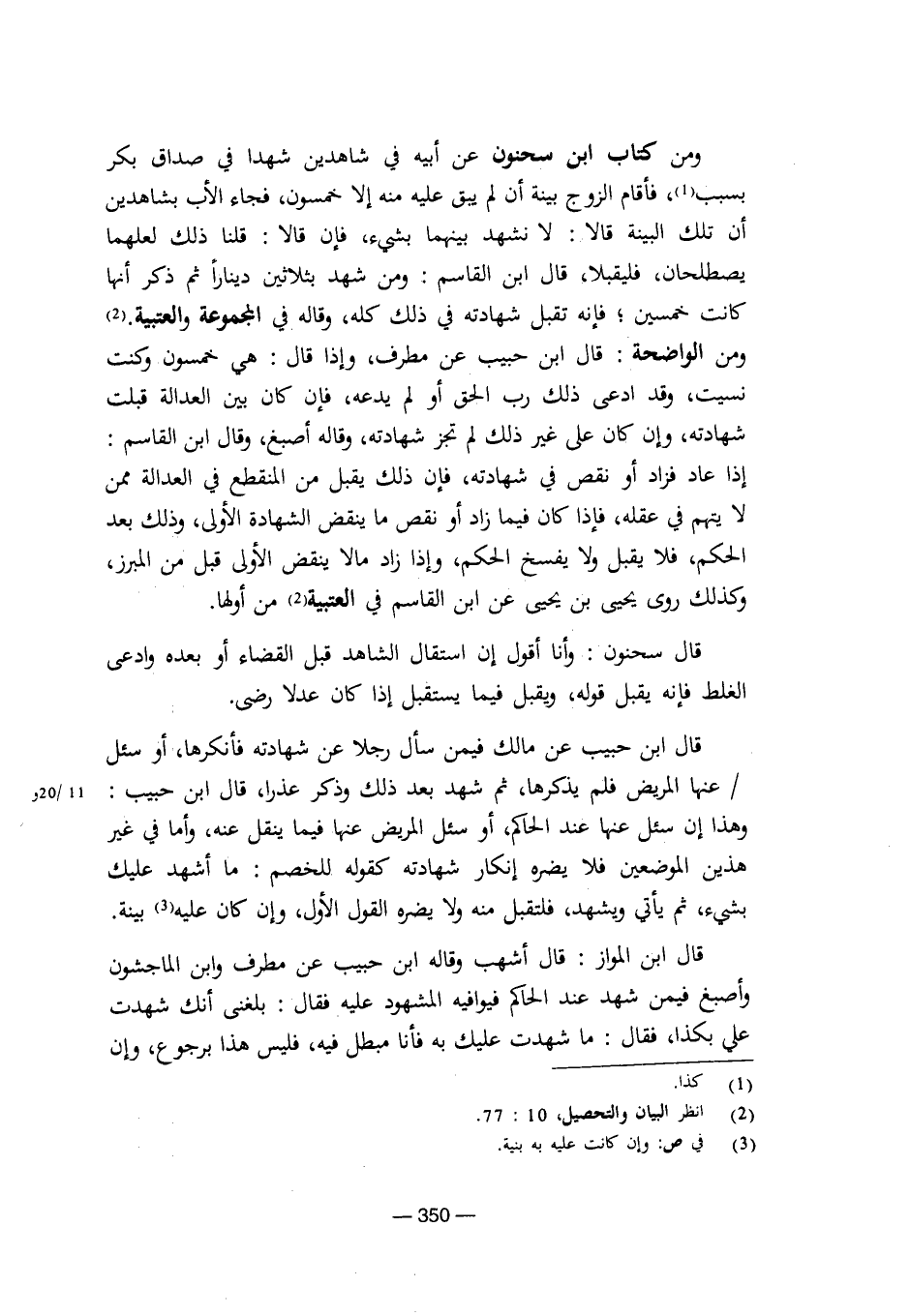 ومن كتاب ابن سحنون عن أبيه في الشاهدين شهدا في صداق بكر بسبب، فأقام الزوج بينة أن لم يبق عليه منه إلا خمسون، فجاء الأب بشاهدين أن تلك البينة قالا: لا نشهد بينهما بشيء، فإن قالا: قلنا ذلك لعلهما بصطلحان، فليقبلا، قال ابن القاسم: ومن شهد بثلاثين ديناراً ثم ذكر أنها كانت خمسين؛ فإنه تقبل شهادته في ذلك كله، وقاله في المجموعة والعتبية. ومن الواضحة: قال ابن حبيب عن مطرف، وإذا قال: هي خمسون وكنت نسيت، وقت ادعى ذلك رب الحق أو لم يدعه، فإن كان بين العدالة قبلت شهادته، وإن كان على غير ذلك لم تجز شهادته، وقاله أصبغ، وقال ابن القاسم: إذا عاد فزاد أو نقص في شهادته، فإن ذلك يقبل من المنقطع في العدالة ممن لا يتهم في عقله، فإذا كان فيما زاد أو نقص ما ينقض الشهادة الأولى، وذلك بعد الحكم، فلا يقبل ولا يفسخ الحكم، وإذا زاد مالا ينقض الأولى قبل من المبرز، وكذلك روى يحيى بن يحيى عن ابن القاسم في العتبية من أولها.