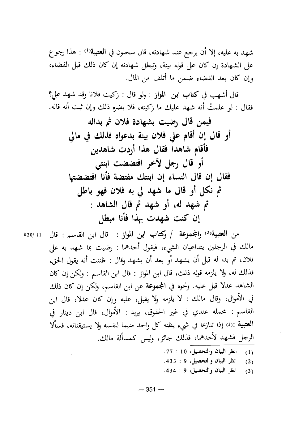 شهد به عليه، إلا أن يرجع عند شهادته، قال سحنون في العتبية: هذا رجوع على الشهادة إن كان على قوله بينه، وتبطل شهادته إن كان ذلك قبل القضاء، وإن كان بعد القضاء ضمن ما أتلف من المال.