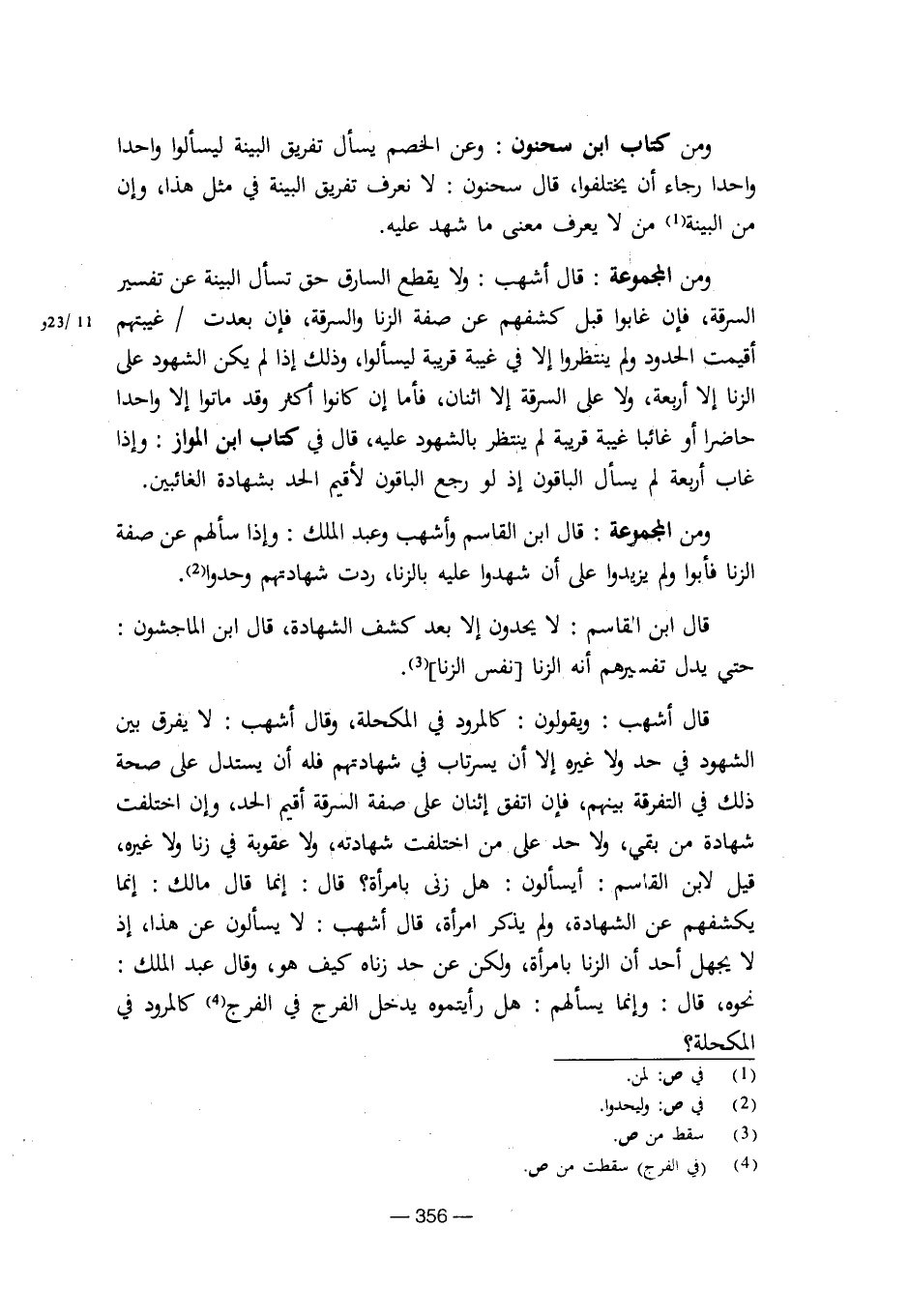 قال أشهب: ويقولون: كالمرود في المكحلة، وقال أشهب: لا يفرق بين الشهود في حد ولا غيره غلا أن يسرتاب في شهادتهم فله أن يستدل على صحة ذلك في التفرقة بينهم، فإن اتفق إثنان على صفة السرقة أقيم الحد، وإن اختلفت شهادة من بقي، ولا حد على من اختلفت شهادته، ولا عقوبة في زنا ولا غيره، قيل لابن القاسم: أيسألون: هل زنى بالمرأة؟ قال: إنما قال مالك: إنما يكشفهم عن الشهادة، ولم يذكر امرأة، قال أشهب: لا يسألون عن هذا، إذ لا يجهل أحد أن الزنا بامرأة، ولكن عن حد زناه كيف هو، وقال عبد الملك: نحوه، قال: وإنما يسألهم: هل رأيتموه يدخل الفرج في الفرج كالمرود في المكحلة؟ [8/ 356]
