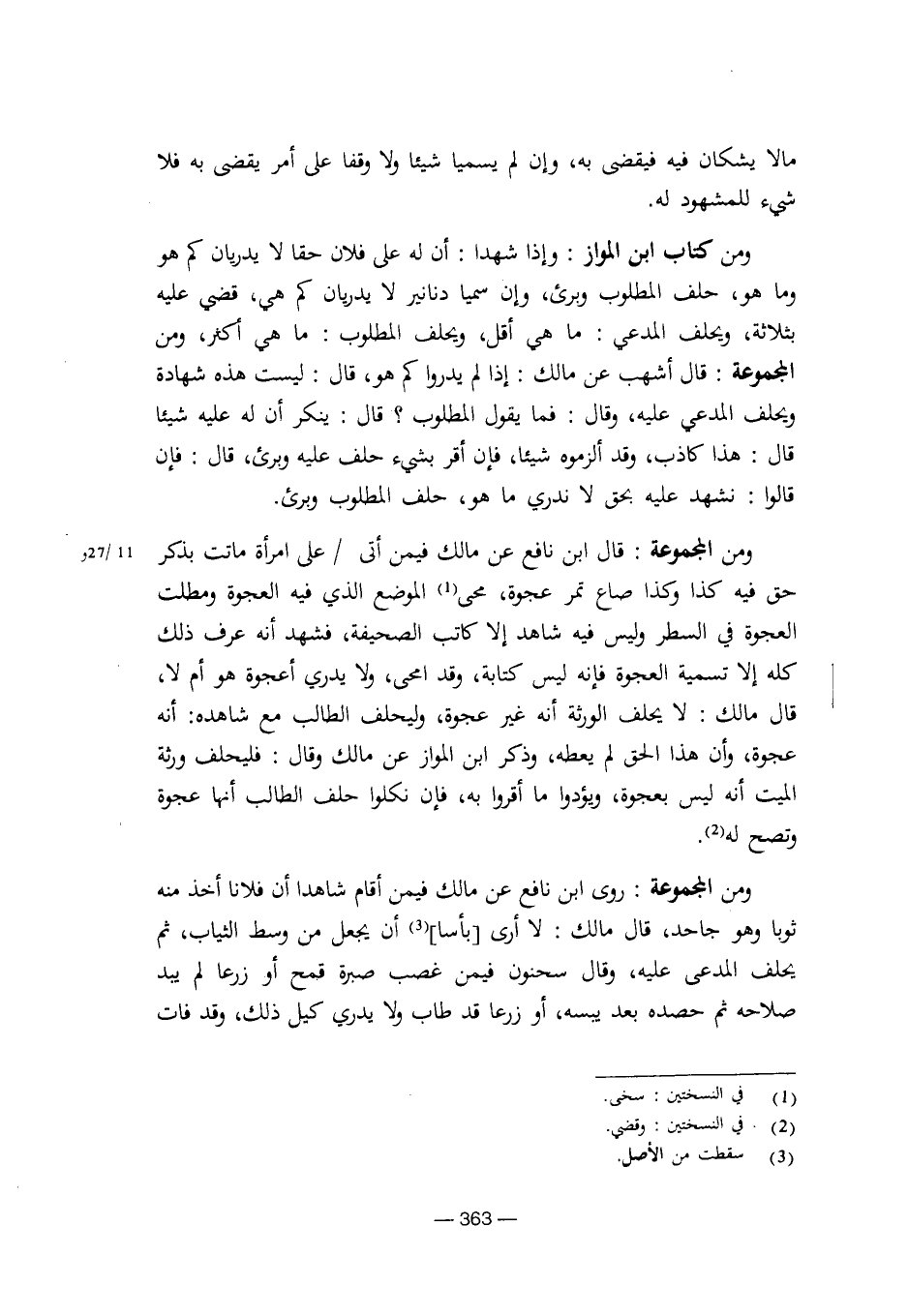 ومن المجموعة: قال ابن نافع عن مالك فيمن أتى/ على امرأته ماتت بذكر حق فيه كذا وكذا صاع تمر عجوة، محى الموضع الذي فيه العجوة ومطلت العجوة في السطر وليس فيه شاهد إلا كاتب الصحيفة، فشهد أنه عرف ذلك كله إلا تسمية العجوة فإنه ليس كتابة، وقد امحى، ولا يدري أعجوة هو أم لا، قال مالك: لا يحلف الورثة أنه غير عجوة، وليحلف الطالب مع شاهده: أنه عجوة، وأن هذا الحق لم يعطه، وذكر ابن المواز عن مالك وقال: فليحلف ورثة الميت أنه ليس بعجوة، ويؤدوا ما أقروا به، فإن نكلوا حلف الطالب أنها عجوة وتصح له.