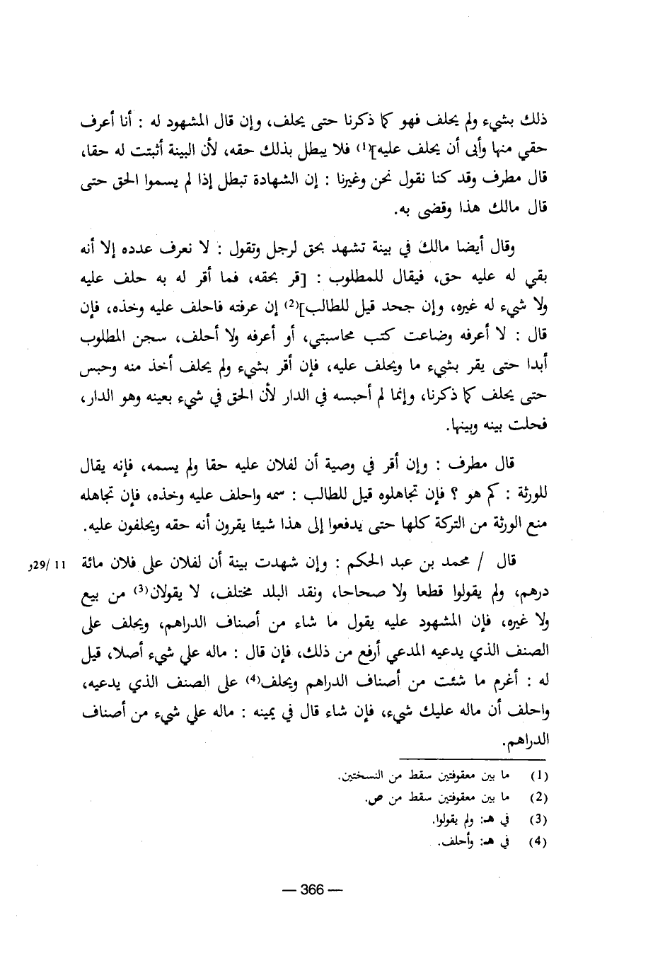 قال/ محمد بن عبد الحكم: وإن شهدت بينة أن لفلان على فلان مائة درهم، ولم يقولوا قطعا ولا صحاحا، ونقد البلد مختلف، لا يقولان من بيع ولا غيره، فإن المشهود عليه يقول ما شاء من أصناف الدراهم، ويحلف على الصنف الذي يدعيه المدعي أرفع من ذلك، فإن قال: ماله علي شيء أصلا، قيل له: أغرم ما شئت من أصناف الدراهم ويحلف على الصنف الذي يدعيه، واحلف أن ماله عليك شيء، فإن شاء قال في يمينه: ماله على شيء من أصناف الدراهم. [8/ 366]
