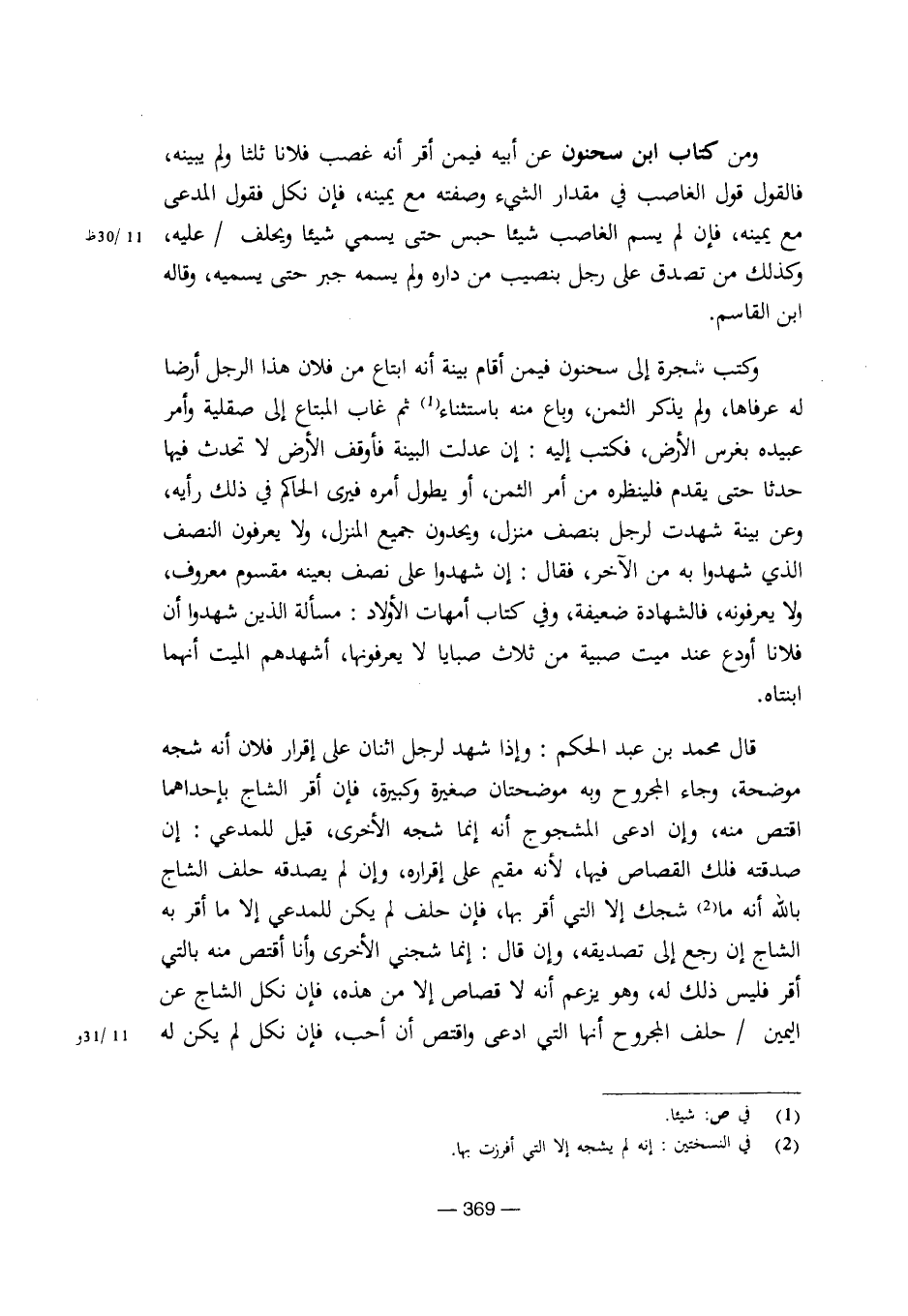 وكتب شجرة إلى سحنون فيمن أقام بينة أنه ابتاع من فلان هذا الرجل أرضا له عرفاها، ولم يذكر الثمن، وباع منه باستثناء ثم غاب المبتاع إلى صقلية وأمر عبيده بغرس الأرض، فكتب إليه: إن عدلت البينة فأوقف الأرض لا تحدث فيها حدثا حتى يقدم فلينظره من أمر الثمن، أو يطول أمره فيرى الحاكم في ذلك رأيه، وعن بينة شهدت لرجل بنصف منزل، ويحدون جميع المنزل، ولا يعرفون النصف الذي شهدوا به من الآخر، فقال: إن شهدوا على نصف بعينه مقسوم معروف، ولا يعرفونه، فالشهادة ضعيفة، وفي كتاب أمهات الأولاد: مسألة الذين شهدوا أن فلانا أودع عند ميت صبية من ثلاث صبايا لا يعرفونها، أشهدهم الميت أنهما ابنتاه.