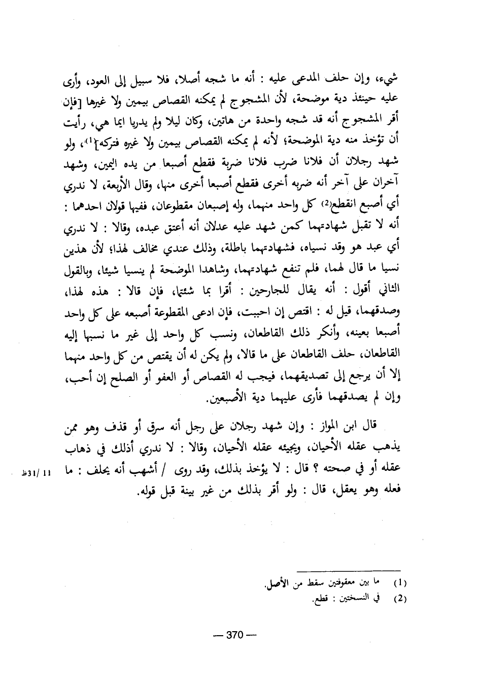 قال ابن المواز: وإن شهد رجلان على رجل أنه سرق أو قذف وهو ممن يذهب عقله الأحيان، ويجيئه عقله الأحيان، وقالا: لا ندري أذلك في ذهاب عقله أو في صحته؟ قال: لا يؤخذ بذلك، وقد روى / أشهب أنه يحلف: ما فعله وهو يعقل، قال: ولو أقر بذلك من غير بينة قبل قوله. [8/ 370]