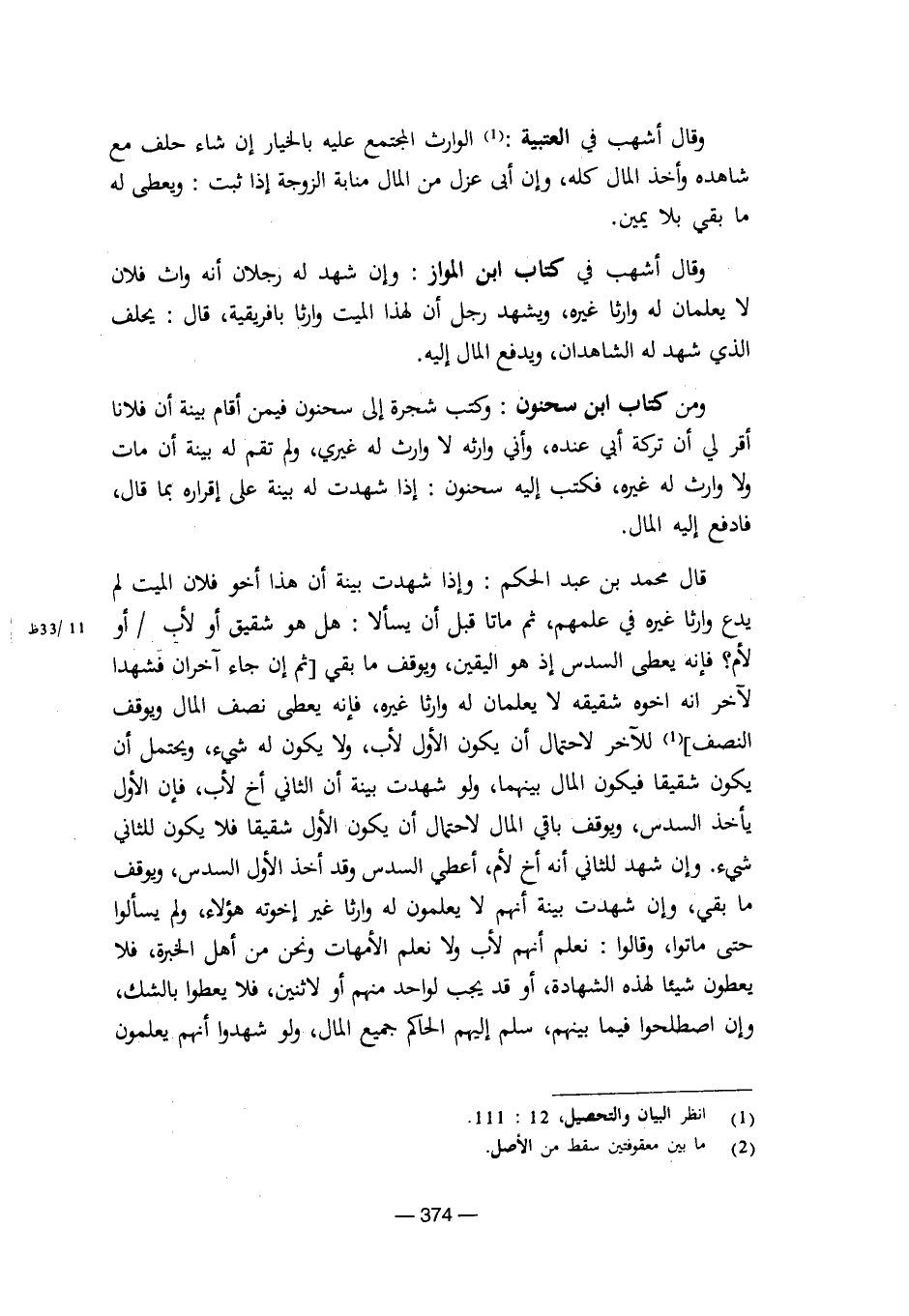 قال محمد بن عبد الحكم: وإذا شهدت بينة أن هذا أخو فلن الميت لم يدع وارثا غيره في علمهم، ثم ماتا قبل أن يسألا: هل هو شقيق أو لأب / أو لأم؟ فإنه يعطى السدس إذ هو اليقين، ويوقف ما بقي [ثم إن جاء آخران فشهدا لآخر انه أخوه شقيقه لا يعلمان له وارثا غيره، فإنه يعطى نصف المال ويوقف النصف] للآخر لاحتمال أن يكون الأول لأب، ولا يكون له شيء، ويحتمل أن يكون شقيقا فيكون المال بينهما، ولو شهدت بينة أن الثاني أخ لأب، فإن الأول يأخذ السدس، ويوقف باقي المال لاحتمال أن يكون الأول شقيقا فلا يكون للثاني شيء، وإن شهد للثاني أنه أخ لأم، أعطي السدس وقد أخذ الأول السدس، ويوقف ما بقي، وإن شهدت بينة أنهم لا يعلمون له وارثا غير إخوته هؤلاء، ولم يسألوا حتى ماتوا، وقالوا: نعلم أنهم لأب ولا نعلم الأمهات ونحن من أهل الخبرة، فلا يعطون شيئا لهذه الشهادة، أو قد يجب لواحد منهم أو لاثنين، فلا يعطوا بالشك، وإن اصطلحوا فيما بنيهم، سلم إليهم الحاكم جميع المال، ولو شهدوا أنهم يعلمون [8/ 374]