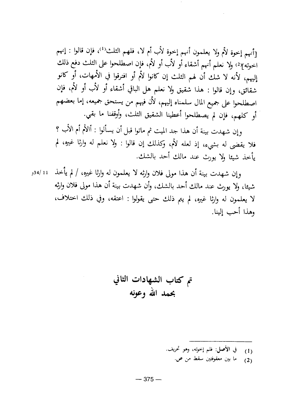[أنهم إخوة لأم ولا يعلمون أنهم إخوة لأب أم لا، فلهم الثلث، فإن قالوا: إنهم اخوته] ولا نعلم أنهم أشقاء أو لأب أو لأم، فإن اصطلحوا على الثلث دفع ذلك إليهم، لأنه لاشك أن لهم الثلث إن كانوا لأم أو افترقوا في الأمهات، أو كانوا شقائق، وإن قالوا: هذا شقيق ولا نعلم هل الباقي أشقاء أو لأب أو لأم، فإن اصطلحوا على جميع المال سلمناه إليهم، لأن فيهم من يستحق جميعه، إما بعضهم أو كلهم، فإن لم يصطلحوا أعطينا الشقيق الثلث، وأوقفنا ما بقي.