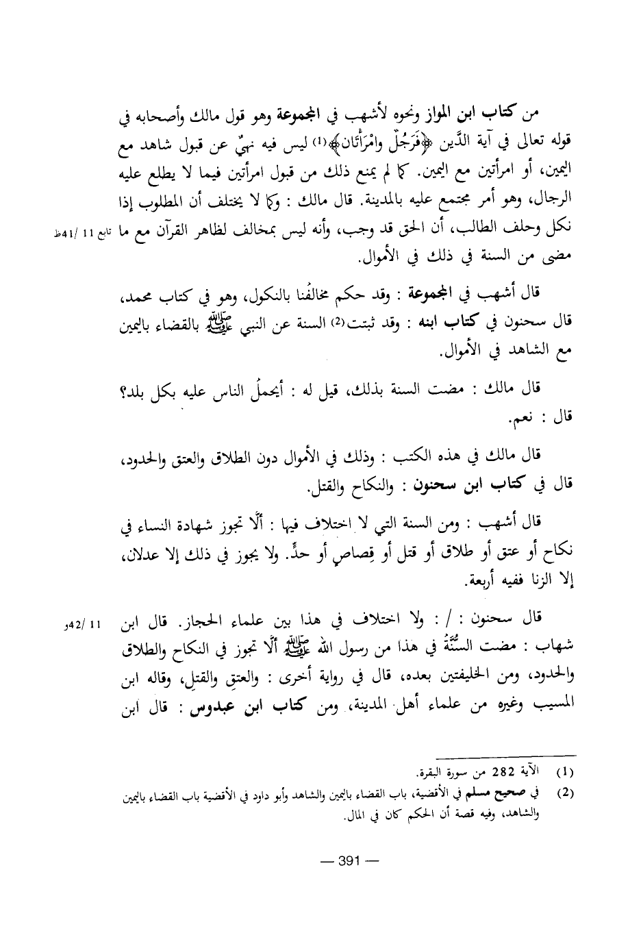 من كتاب ابن المواز ونحوه لأشهب في المجموعة وهو قول مالك وأصحابه في قوله تعالى في آيه الدين (فرجل وامرأتان) ليس فيه نهي عن قبول شاهد مع اليمين، أو امرأتين مع اليمين. كما لم يمنع ذلك من قبول امرأتين فيما لا يطلع عليه الرجال، وهو أمر مجتمع عليه بالمدينة. قال مالك: وكما لا يختلف أن المطلوب إذا نكل وحلف الطالب، أن الحق قد وجب، وأنه ليس بمخالف لظاهر القران مع ما مضي من السن في ذلك في الأموال.