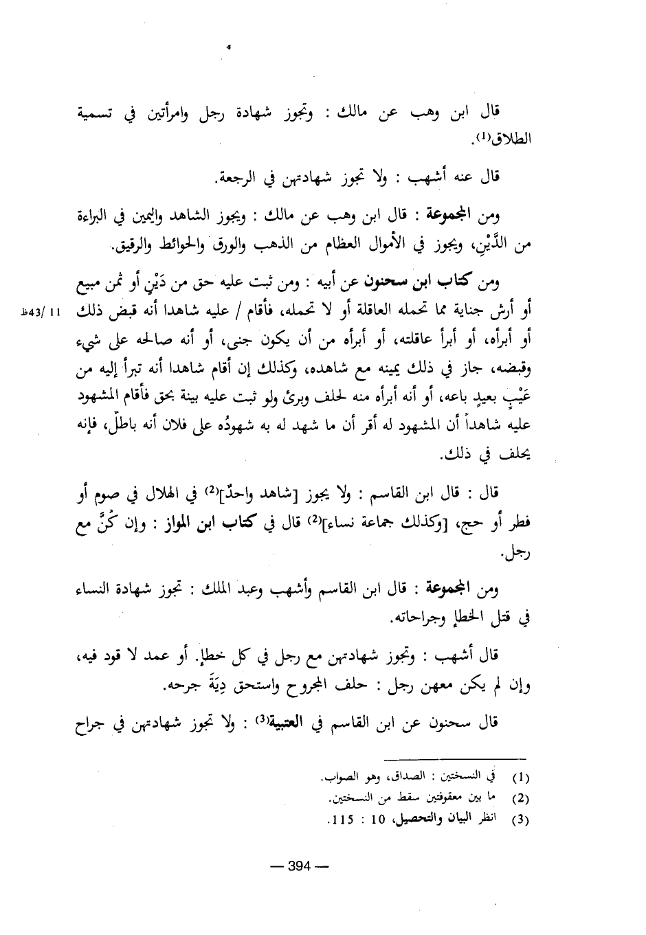 قال سحنون عن ابن القاسم في العتبية: ولا تجوز شهادتهن في جراح [8/ 394]