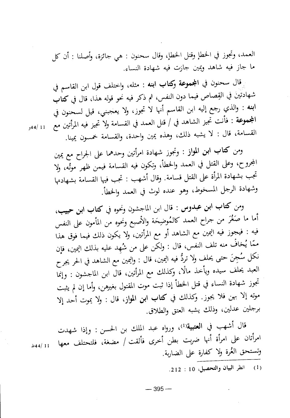 ومن كتاب ابن عبدوس: قال ابن الماجشون ونحوه في كتاب ابن حبيب، أما ما صغر من جراح العمد كالموضحة والأصبع ونحوه من المأمون على النفس فيه: فيجوز فيه اليمين مع الشاهد أو مع المرأتين، ولايكون ذلك فيما فوق هذا مما يخاف منه تلف النفس، قال: ولكن على من شهد عليه بذلك اليمين، فإن نكل سجن حتى يحلف ولا ترد فيه اليمين، قال: واليمين مع الشاهد في الحر يجرح العبد يحلف سيدة ويأخذ مالا، وكذلك مع المرأتين، قال ابن الماجشون: وإنما تجوز شهادة النساء في قتل الخطأ إذا ثبت موت المقتول بغيرهن، وأما إن لم يثبت موته إلا بهن فلا يجوز. وكذلك في كتاب ابن المواز، قال: ولا يموت أحد إلا برجلين عدلين، وذلك يشبه العتق والطلاق.