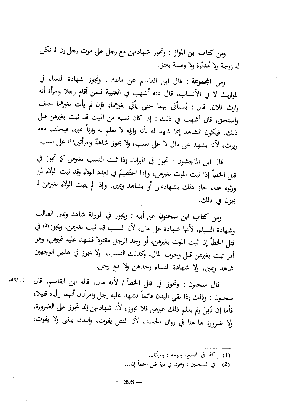 قال سحنون: وتجوز في قتل الخطأ / لأنه مال، قاله ابن القاسم، قال سحنون: وذلك إذا بقي البدن قائماً فشهد عليه رجل وامرأتان أنهما رأياه قتيلا، فأما إن دفن ولم يعلم ذلك غيرهن فلا تجوز، لأن شهادتهن إنما تجوز على الضرورة، ولا ضرورة ها هنا في زوال الجسد، لأن القتل يفوت، والبدن يبقي ولا يفوت، [8/ 396]