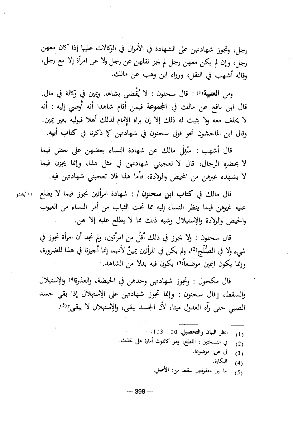 قال مكحول: وتجوز شهدتهن وحدهن في الحيضة، والعذرة والاستهلال والسقط، [قال سحنون: وإنما تجوز شهادتهن على الاستهلال إذا بقي جسد الصبي حتى رآه العدول ميتا، ولأن الجسد يبقى، والاستهلال لا يبقى]. [8/ 398]