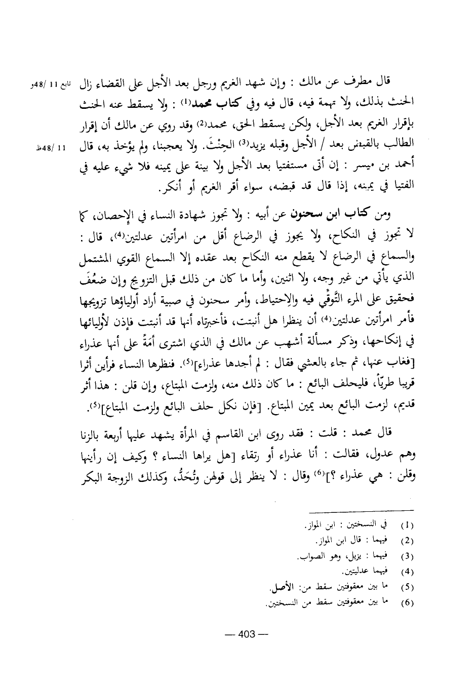 ومن كتاب ابن سحنون عن أبيه: ولا تجوز شهادة النساء في الإحصان، كما لا تجوز في النكاح، ولا يجوز في الرضاع أقل من امرأتين عدلتين، قال: والسماع في الرضاع لا يقطع منه النكاح بعد عقده إلا السماع القوي المشتمل الذي يأتي من غير وجه، ولا اثنين، وأما ما كان من ذلك قبل التزويج وإن ضعف فحقيق على المرء التوفي فيه والاحتياط، وأمر سحنون في صبية أراد أولياؤها تزويجها فأمر امرأتين عدلتين أن ينظرا هل أنبتت، فأخبرتاه أنها قد أنبتت فإذن لأوليائها في إنكاحها، وذكر مسألة أشهب عن مالك في الذي اشترى امة على أنها عذراء [فغاب عنها، ثم جاء بالعشي فقال: لم أجدها عذراء]. فنظرها النساء فرأين أثرا قريبا طرياً. فليحلف البائع: ما كان ذلك منه، ولزمت المبتاع، وإن قلن: هذا أثر قديم، لزمت البائع بعد يمين المبتاع. [فإن نكل حلف البائع ولزمت المبتاع].