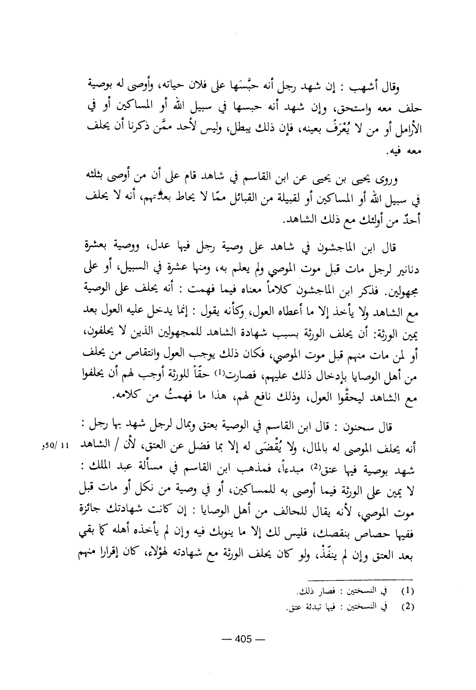 قال سحنون: قال ابن القاسم في الوصية بعتق وبمال لرجل شهد بها رجل: أنه يحلف الموصى له بالمال، ولا يقضى له إلا بما فضل عن العتق، لأن / الشاهد شهد بوصية فيها عتق مبدءاً، فمذهب ابن القاسم في مسألة عبد الملك: لا يمين على الورثة فيما أوصى به للمساكين، أو في وصية من نكل أو مات قبل موت الموصي، لأنه يقال للحالف من أهل الوصايا: إن كانت شهادتك جائزة ففيها حصاص بنقصك، فليس لك إلا ما ينوبك فيه وإن لم يأخذه أهله كما بقي بعد العتق وإن لم ينفذ، ولو كان يحلف الورثة مع شهادته لهؤلاء، كان إقرارا منهم [8/ 405]