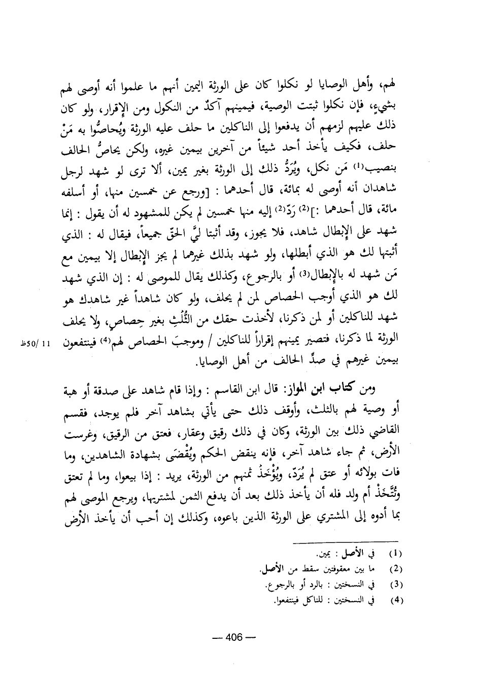 لهم، وأهل الوصايا لو نكلوا كان على الورثة اليمين أنهم ما علموا أنه أوصى لهم بشيء، فإن نكلوا ثبتت الوصية، فيمينهم آكد من النكول ومن الإقرار، ولو كان ذلك عليهم لزمهم أن يدفعوا إلى الناكلين ما حلف عليه الورثة ويحاصوا به من حلف، فكيف يأخذ أحد شيئا من آخرين بيمين غيره، ولكن يحاص الحالف بنصيب من نكل، ويرد ذلك إلى الورثة بغير يمين، ألا ترى لو شهد لرجل شاهدان أنه أوصى له بمائة، قال أحدهما: [ورجع عن خمسين منها، أو أسلفه مائة، قال أحدهما:] رد إليه منها خمسين لم يكن للمشهود له أن يقول: إنما شهد على الإبطال شاهد، فلا يجوز، وقد أثبتا لي الحق جميعاً، فيقال له: الذي أثبتها لك هو الذي أبطلها، ولو شهد بذلك غيرهما لم يجز الإبطال إلا بيمين مع من شهد له بالإبطال أو بالرجوع، وكذلك يقال للموصى له: إن الذي شهد لك هو الذي أوجب الحصاص لمن لم يحلف، ولو كان شاهداً غير شاهدك هو شهد للناكلين أو لمن ذكرنا، لأخذت حقك من الثلث بغير حصاص، ولا يحلف الورثة لما ذكرنا، فتصير يمينهم إقراراً للناكلين/ وموجب الحصاص لهم فينتفعون بيمين غيرهم في صد الحالف من أهل الوصايا.