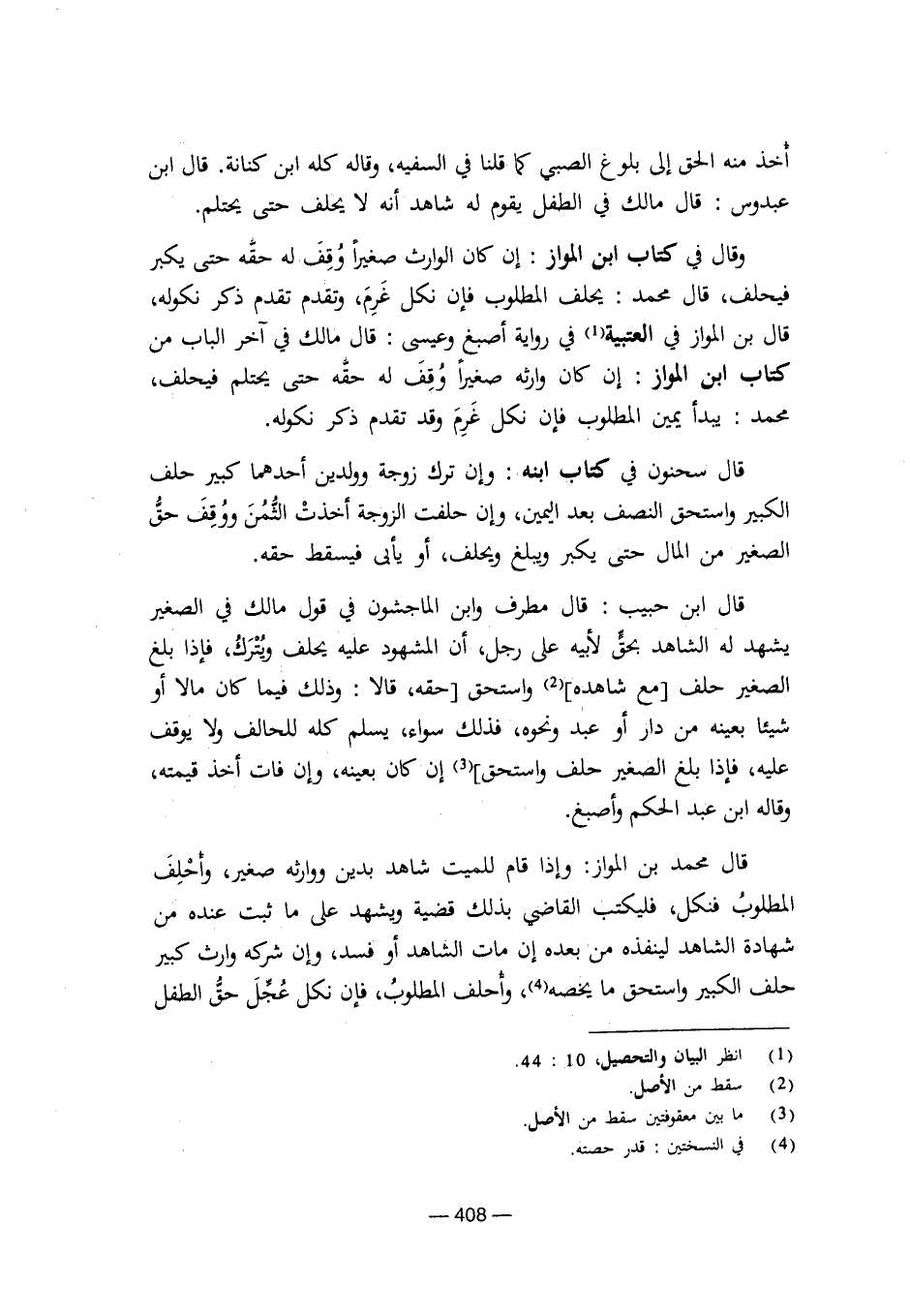 قال ابن حبيب: قال مطرف وابن الماجشون في قول مالك في الصغير يشهد له الشاهد بحق لأبيه على رجل، أن المشهود عليه يحلف ويترك، فإذا بلغ الصغير حلف [مع شاهده] واستحق [حقه، قالا: وذلك فيما كان مالا أو شيئا بعينه من دار أو عبد ونحوه، فذلك سواء، يسلم كله للحالف ولا يوقف عليه، فإذا بلغ الصغير حلف واستحق] إن كان بعينه، وإن فات أخذ قيمته، وقاله ابن عبد الحكم وأصبغ.