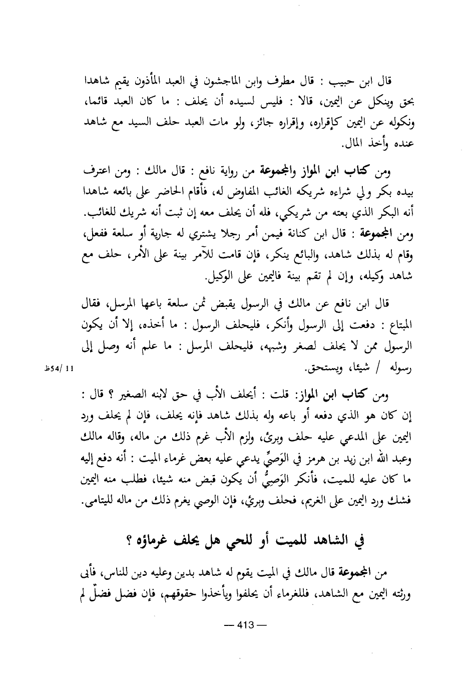 من المجموعة قال مالك في الميت يقوم له شاهد بدين وعليه دين للناس، فأبى ورثته اليمين مع الشاهد، فللغرماء أن يحلفوا ويأخذوا حقوقهم، فإن فضل فضل لم [8/ 413]