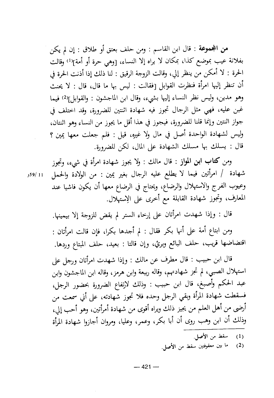 من المجموعة: قال ابن القاسم: ومن حلف بعتق أو طلاق: وإن لم يكن بفلانة عيب بموضع كذا، بمكان لا يراه إلا النساء، [وهي حرة أو أمة] وقالت الحرة: لا أمكن من ينظر إلي، وقالت الزوجة الرقيق: لنا ذلك إذا أذنت الحرة في أن تنظر إليها امرأة فنظرت القوابل [فقالت: ليس بها ما قال، قال: لا يحنث وهو مدين، وليس نظر النساء إليها بشيء، وقال ابن الماجشون: والقوابل] فيما غبن عليه، فهي مثل الرجال تجوز فيه شهادة اثنتين للضرورة، وقد اختلف في جواز اثنتين وإنما قلنا للضرورة، فيجوز في هذا أقلما يجوز من النساء وهو اثنتان، وليس لشهادة الواحدة أصل في مال ولا غيره، قيل: فلم جعلت معها يمين؟ قال: يسلك بها مسلك الشهادة على المال، لكن للضرورة.