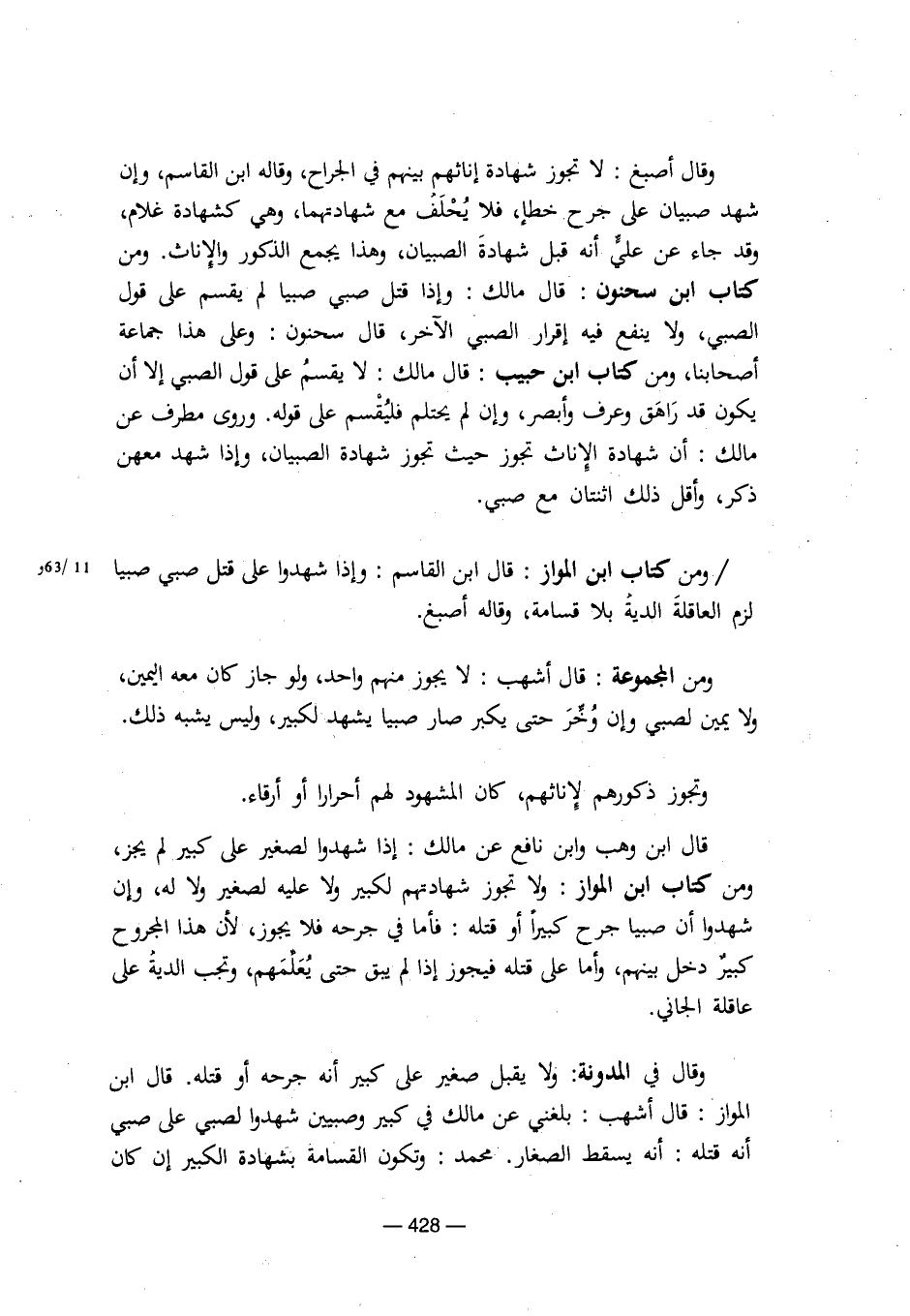 وقال في المدونة: ولا يقبل صغير على كبير أنه جرحه أو قتله. قال ابن المواز: قال أشهب: بلغني عن مالك في كبير وصبيين شهدوا لصبي على صبي أنه قتله: أنه يسقط الصغار. محمد: وتكون القسامة بشهادة الكبير إن كان [8/ 428]
