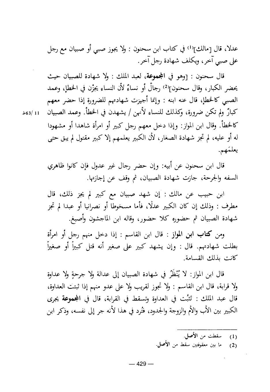 عدلا، قال [مالك] في كتاب ابن سحنون: ولا يجوز صبي أو صبيان مع رجل على صبي آخر، ويكلف شهادة رجل آخر.
