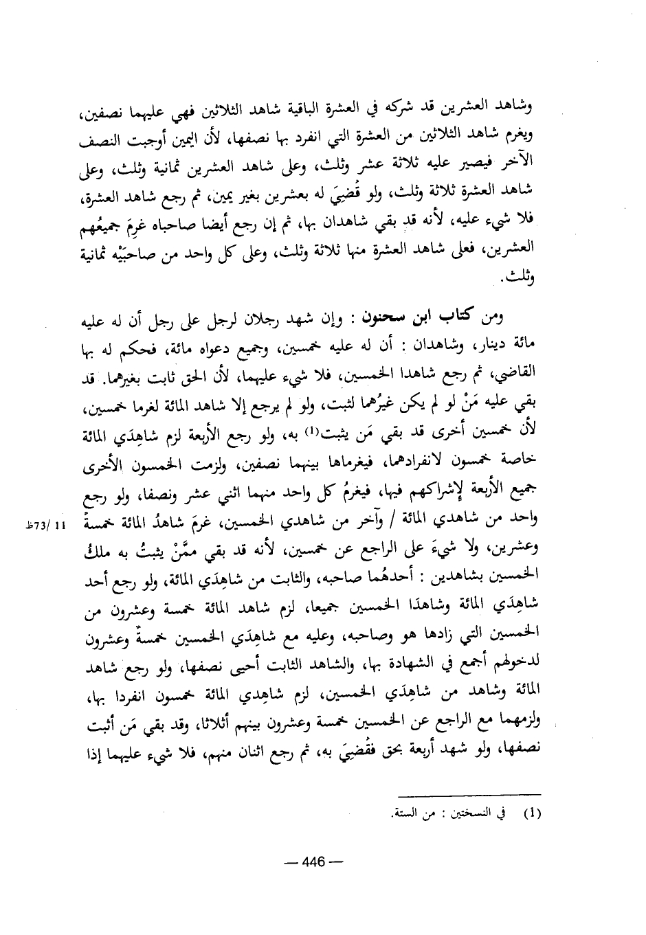 ومن كتاب ابن سحنون: وإن شهد رجلان لرجل على رجل أن له عليه مائة دينار، وشاهدان: أن له عليه خمسين، وجميع دعواه مائة، فحكم له بها القاضي، ثم رجع شاهدا الخمسين، فلا شيء عليهما، لأن الحق ثابت بغيرهما. قد بقي عليه من لو لم يكن غيرهما لثبت، ولو لم يرجع إلا شاهد المائة لغرما خمسين، لأن خمسين أخرى قد بقي من يثبت به، ولو رجع الأربعة لزم شاهدي المائة خاصة خمسون لانفرادهما، فيغرماها بينهما نصفين، ولزمت الخمسون الأخرى جميع الأربعة لإشراكهم فيها، فيغرم كل واحد منهما اثني عشر ونصفا، ولو رجع واحد من شاهدي المائة/ وآخر من شاهدي الخمسين، غرم شاهد المائة خمسة وعشرين، ولا شيء على الراجع عن خمسين، لأنه قد بقي ممن يثبت به ملك الخمسين بشاهدين: أحدهما صاحبه، والثابت من شاهدي المائة، ولو رجع أحد شاهدي المائة وشاهدا الخمسين جميعا، لزم شاهد المائة خمسة وعشرون من الخمسين التي زادها هو وصاحبه، وعليه مع شاهدي الخمسين خمسة وعشرون لدخولهم أجمع في الشهادة بها، والشاهد الثابت أحيى نصفها، ولو رجع شاهد المائة وشاهد من شاهدي الخمسين، لزم شاهدي المائة خمسون انفراد بها، ولزمهما مع الراجع عن الخمسين خمسة وعشرون بينهم أثلاثا، وقد بقي من أثبت نصفها، ولو شهد أربعة بحق فقضي به، ثم رجع اثنان منهم، فلا شيء عليهما إذا [8/ 446]
