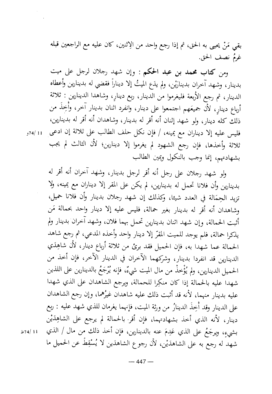 ومن كتاب محمد بن عبد الحكم: وإن شهد رجلان لرجل على ميت بدينار، وشهد آخران بدينارين، ولم يدع الميت إلا ديناراً فقضي له بدينارين وأعطاه الدينار، ثم رجع الأربعة فليغرموا من الدينار، ربع دينار، وشاهدا الدينارين: ثلاثة أرباع دينار، لأن جميعهم اجتمعوا على دينار، وانفرد اثنان بدينار آخر، وأخذ من ذلك كله دينار، ولو شهد إثنان أنه أقر له بدينار، وشاهدان أنه أقر له بدينارين، فليس عليه إلا ديناران مع يمينه،/ فإن نكل حلف الطالب على ثلاثة إن ادعى ثلاثة وأخذها، فإن رجع الشهود لم يغرموا إلا دينارين؛ لأن الثالث لم يجب بشهادتهم، إنما وجب بالنكول ويمين الطالب.