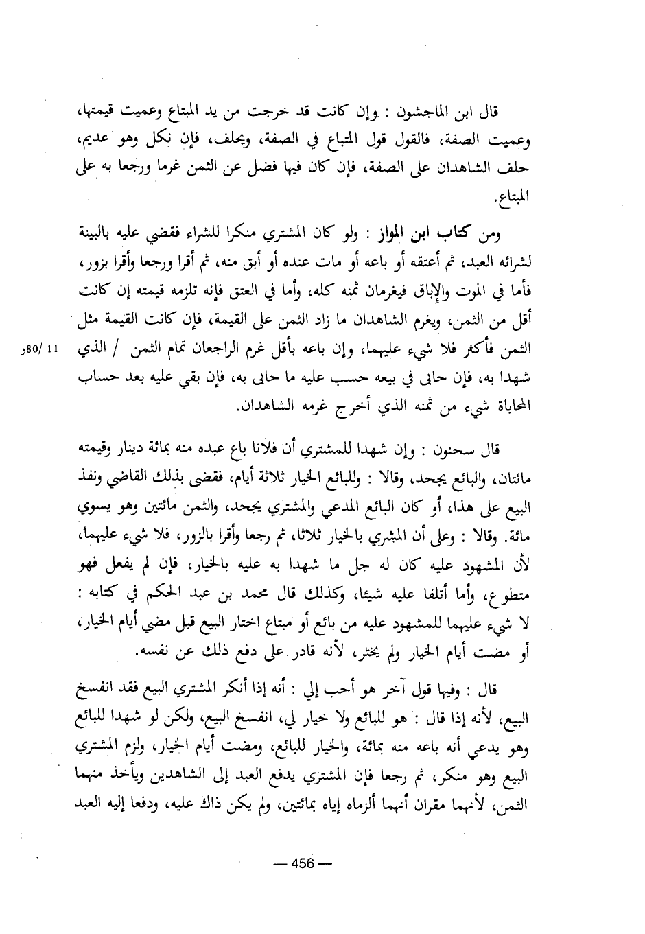قال: وفيها قول آخر هو أحب إلي: أنه إذا أنكر المشتري البيع فقد انفسخ البيع، لأنه إذا قال: وهو للبائع ولا خيار لي، انفسخ البيع، ولكن لو شهدا للبائع وهو يدعي أنه باعه منه بمائة، والخيار للبائع، ومضت أيام الخيار، ولزم المشتري البيع وهو منكر، ثم رجعا فإن المشتري يدفع العبد إلى الشاهدين ويأخذ منهما الثمن، لأنهما ألزماه إياه بمائتين، ولم يكن ذاك عليه، ودفعا إليه العبد [8/ 456]