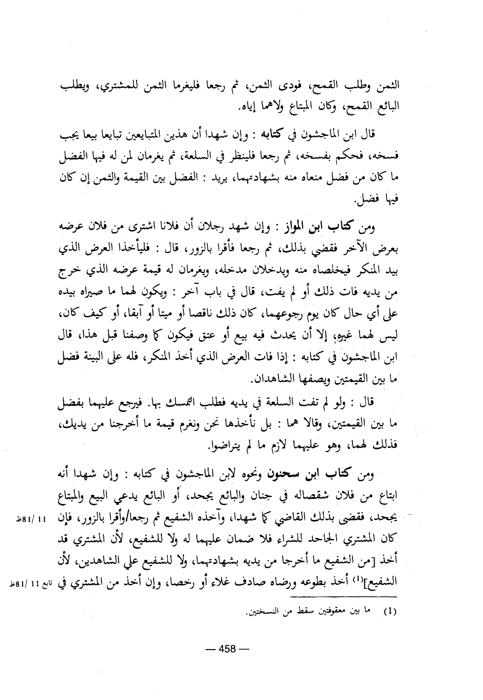 ومن كتاب ابن سحنون ونحوه لابن الماجشون في كتابه: وإن شهدا أنه ابتاع من فلان شقصاله في جنان والبائع يجحد، أو البائع يدعي البيع والمبتاع بجحد، فقضي بذلك القاضي كما شهداء، وآخذه الشفيع ثم رجعا / وأقرا بالزور، فإن كان المشتري الجاحد للشراء فلا ضمان عليهما له ولا للشفيع، لأن المشتري قد أخذ [من الشفيع ما أخرجا من يديه بشهادتهما، ولا للشفيع على الشاهدين، لأن الشفيع] أخذ بطوعه ورضاه صادف غلاء أو رخصا، وإن أخذ من المشتري في [8/ 458]