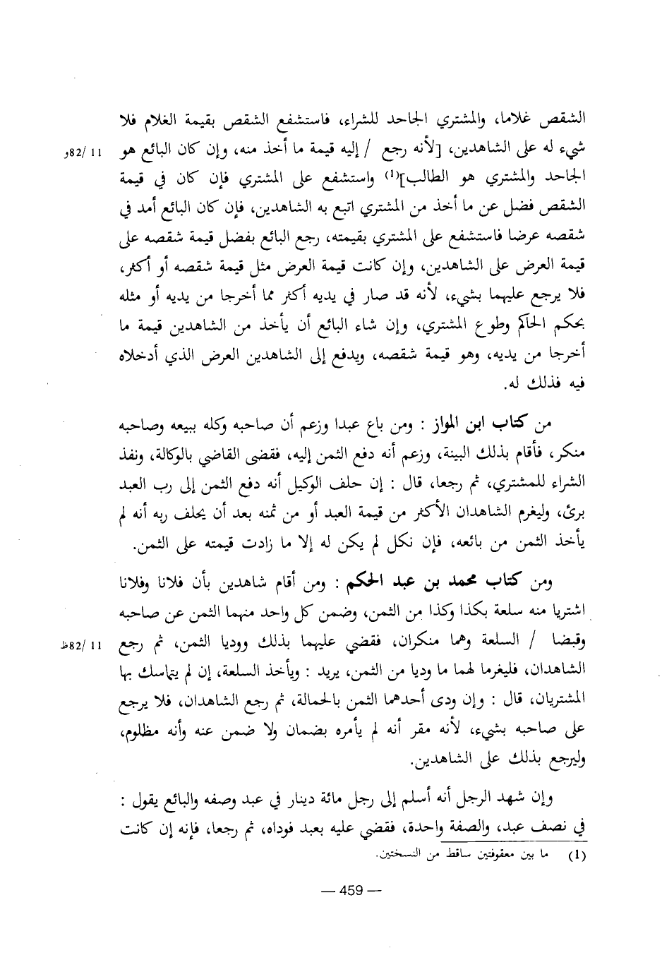 الشقص غلاما، والمشتري الجاحد للشراء، فاستشفع الشقص بقيمة الغلام فلا شيء له على الشاهدين، [لأنه رجع/ إليه قيمة ما أخذ منه، وإن كان البائع هو الجاحد والمشتري هو الطالب] واستشفع على المشتري فإن كان في قيمة الشقص فضل عن ما أخذ من المشتري اتبع به الشاهدين، فإن كان البائع أمد في شقصه عرضا فاستشفع على المشري بقيمته، رجع البائع بفضل قيمة شقصه على قيمة العرض على الشاهدين، وإن كانت قيمة العرض مثل قيمة شقصه أو أكثر، فلا يرجع عليهما بشيء، لأنه قد صار في يديه أكثر مما أخرجا من يديه أو مثله بحكم الحاكم وطوع المشتري، وإن شاء البائع أن يأخذ من الشاهدين قيمة ما أخرجا من يديه، وهو قيمة شقصه، ويدفع إلى الشاهدين العرض الذي أدخلاه فيه فذلك له.