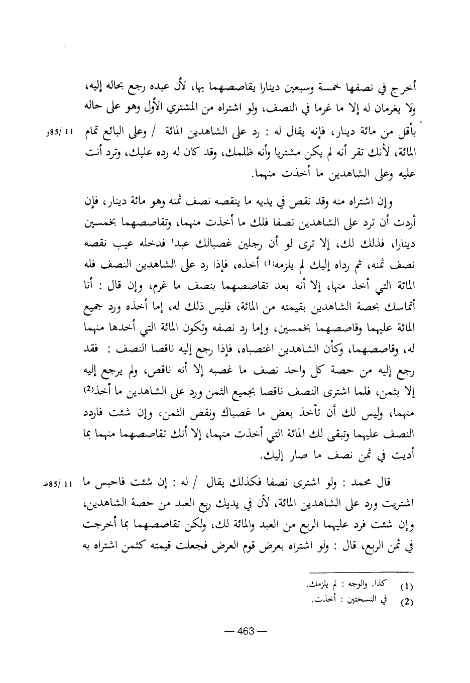 قال محمد ولو اشترى نصفا فكذلك يقال/ له: إن شئت فاحبس ما اشتريت ورد على الشاهدين المائة، لأن في يديك ربع العبد من حصة الشاهدين، وإن شئت فرد عليهما الربع من العبد والمائة لك، ولكن تقاصصهما بما أخرجت في الثمن الربع، قال: ولو اشتراه بعرض قوم العرض فجعلت قيمته كثمن اشتراه به [8/ 463]
