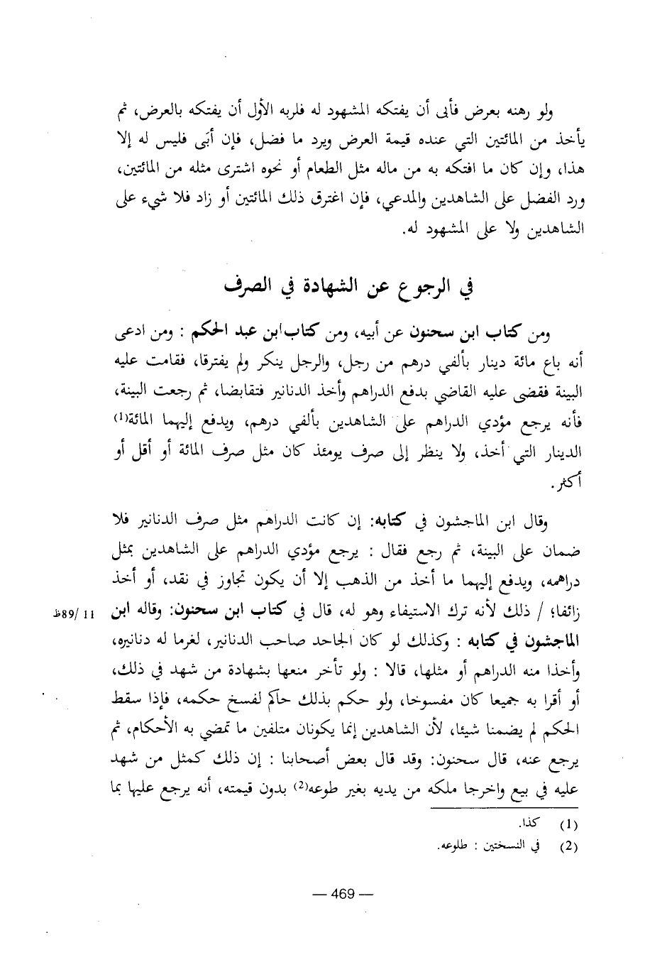 وقال ابن الماجشون في كتابه: إن كانت الدراهم مثل صرف الدنانير فلا ضمان على البينة، ثم رجع فقال: يرجع مؤدي الدراهم على الشاهدين يمثل دراهمه، ويدفع إليهما ما أخذ من الذهب إلا أن يكون تجاوز في نقد، أو أخذ زائفا؛ / ذلك لأنه ترك الاستيفاء وهو له، قال في كتاب ابن سحنون: وقاله ابن الماجشون في كتابه: وكذلك لو كان الجاحد صاحب الدنانير، لغرما له دنانيره، وأخذا منه الدراهم أو مثلهما، قالا: ولو تأخر منعها بشهادة من شهد في ذلك، أو أقرا به جميعا كان مفسوخا، ولو حكم بذلك حاكم لفسخ حكمه، فإذا سقط الحكم لم يضمنا شيئا، لأن الشاهدين إنما يكونان متلفين ما تمضي به الأحكام، ثم يرجع عنه، قال سحنون: وقد قال بعض أصحابنا: إن ذلك كمثل من شهد عليه في بيع واخرجا ملكه من يديه بغير طوعه بدون قيمته، أنه يرجع عليها بما [8/ 469]