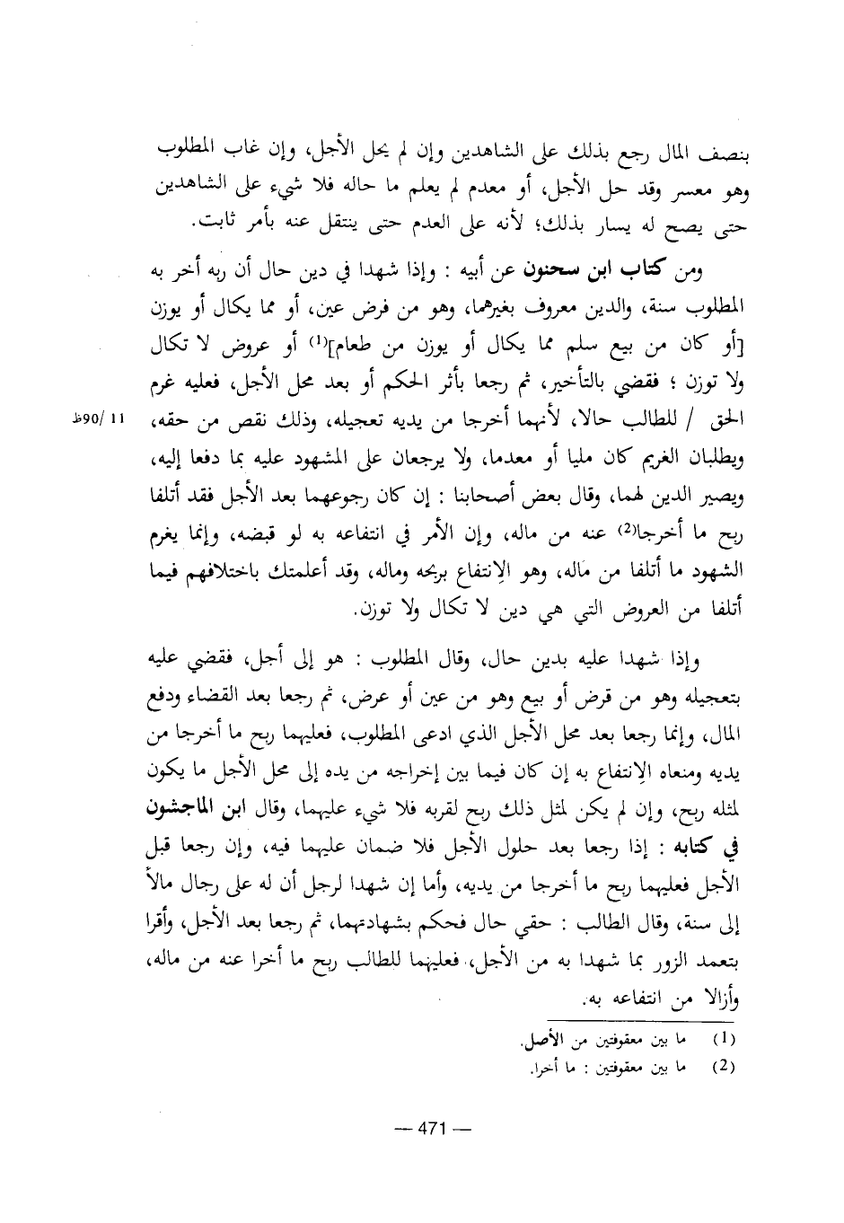 ومن كتاب ابن سحنون عن أبيه: وإذا شهدا في دين حال أن ربه أخر به المطلوب سنة، والدين معروف بغيرهما، وهو من فرض عين، أو مما يكال أو يوزن [أو كان من بيع سلم مما يكال أو يوزن من طعام] أو عروض لا تكال ولا توزن؛ فقضي بالتأخير، ثم رجعا بأثر الحكم أو بعد محل الأجل، فعليه غرم الحق/ للطالب حالا، لأنهما أخرجا من يديه تعجيله، وذلك نقص من حقه، ويطلبان الغريم كان مليا أو معدما، ولا يرجعان على المشهود عليه بما دفعا إليه، ويصير الدين لهما، وقال بعض أصحابنا: إن كان رجوعها بعد الأجل فقد أتلفا ربح ما أخرجا عنه من ماله، وإن الأمر في انتفاعه به لو قبضه، وإنما يغرم الشهود ما أتلفا من ماله، وهو الانتفاع بربحه وماله، وقد أعلمتك باختلافهم فيما أتلفا من العروض التي هي دي لا تكال ولا توزن.