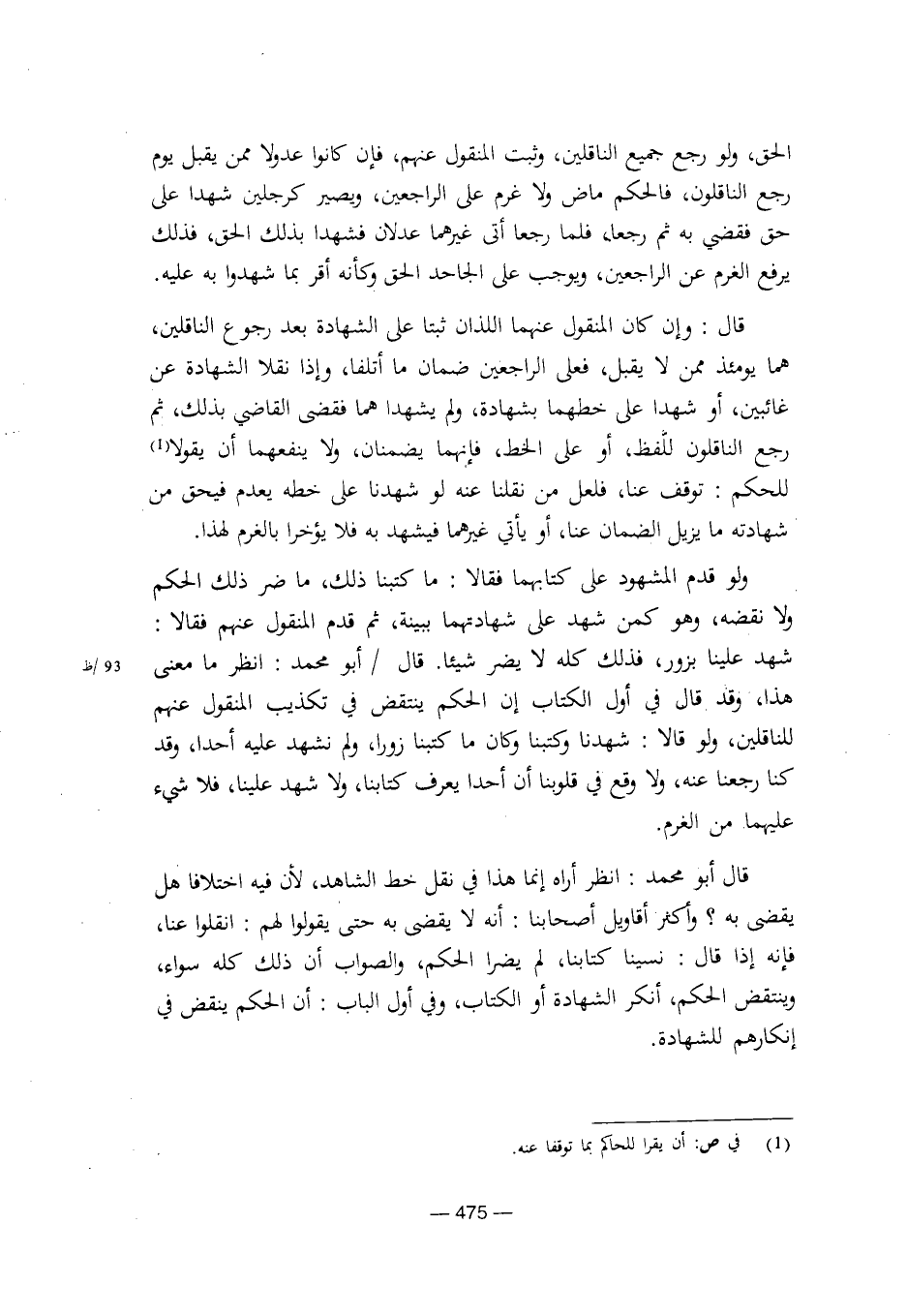 الحق، ولو رجع جميع الناقلين، وثبت المنقول عنهم، فإن كانوا عدولا ممن يقبل يوم رجع الناقلون، فالحكم ماض ولا غرم على الراجعين، ويصير كرجلين شهدا على حق فقضي به ثم رجعا، فلما رجعا أتى غيرهما عدلان فشهدا بذلك الحق، فذلك يرفع الغرم عن الراجعين، ويوجب على الجاحد الحق وكأنه أقر بما شهدوا به عليه.