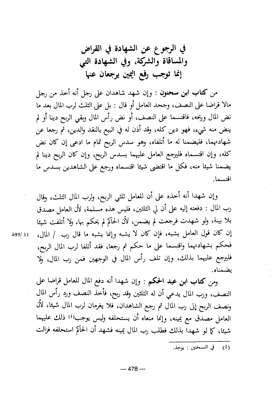 ومن كتاب ابن عبد الحكم: وإن شهدا أنه دفع المال للعامل قراضا على النصف، ورب المال يدعي أن له الثلثين وقد ربح، فأخذ النصف ورد رأس المال ونصف الربح إلى رب المال ثم رجع الشاهدان، فلا يغرمان لرب المال شيئا، لأن العامل مصدق مع يمينه، وإنما منعاه أن يستحلفه وليس يوجب ذلك عليهما شيئا، كما لو شهدا بذلك فطلب رب المال يمينه فشهد أن الحاكم استحلفه فزالت [8/ 478]