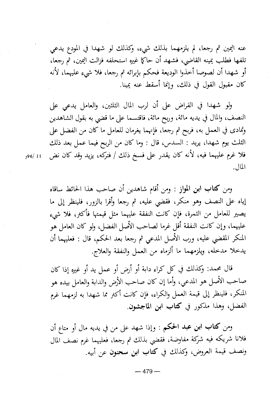 ومن كتاب ابن عبد الحكم: وإذا شهد على من في يديه مال أو متاع أن فلانا شريكه فيه شركة مفاوضة، فقضي بذلك ثم رجعا، فعليهما غرم نصف المال ونصف قيمة العروض، وكذلك في كتاب ابن سحنون عن أبيه. [8/ 479]