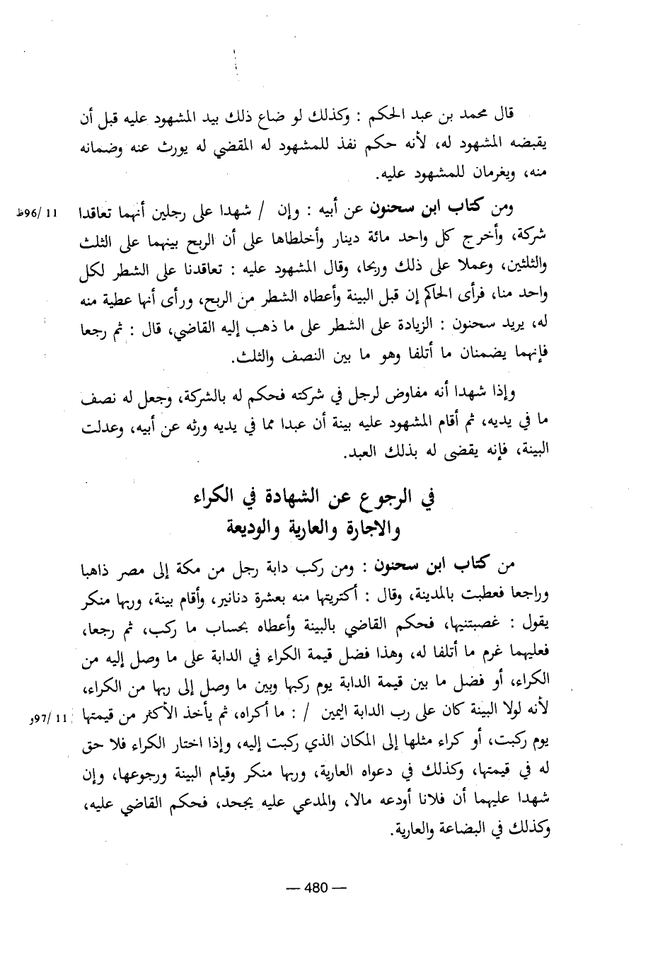 من كتاب ابن سحنون: ومن ركب دابة رجل من مكة إلى مصر ذاهبا وراجعا فعطبت بالمدينة، وقال: أكتريتها منه بعشرة دنانير، وأقام بينة، وربها منكر يقول: غصبتنيها، فحكم القاضي بالبينة وأعطاه بحساب ما ركب، ثم رجعا، فعليهما غرم ما أتلفا له، وهذا فضل قيمة الكراء في الدابة على ما وصل إليه من الكراء، أو فضل ما بين قيمة الدابة يوم ركبها وبين ما وصل إلى ربها من الكراء، لأنه لولا البينة كان على رب الدابة اليمين/: ما أكراه، ثم يأخذ الأكثر من قيمتها يوم ركبت، أو كراء مثلها إلى المكان الذي ركبت إليه، وإذا اختار الكراء فلا حق له في قيمتها، وكذلك في دعواه العارية، وربها منكر وقيام البينة ورجوعها، وإن شهدا عليهما أن فلانا أودعه مالا، والمدعي عليه يجحد، فحكم القاضي عليه، وكذلك في البضاعة والعارية. [8/ 480]