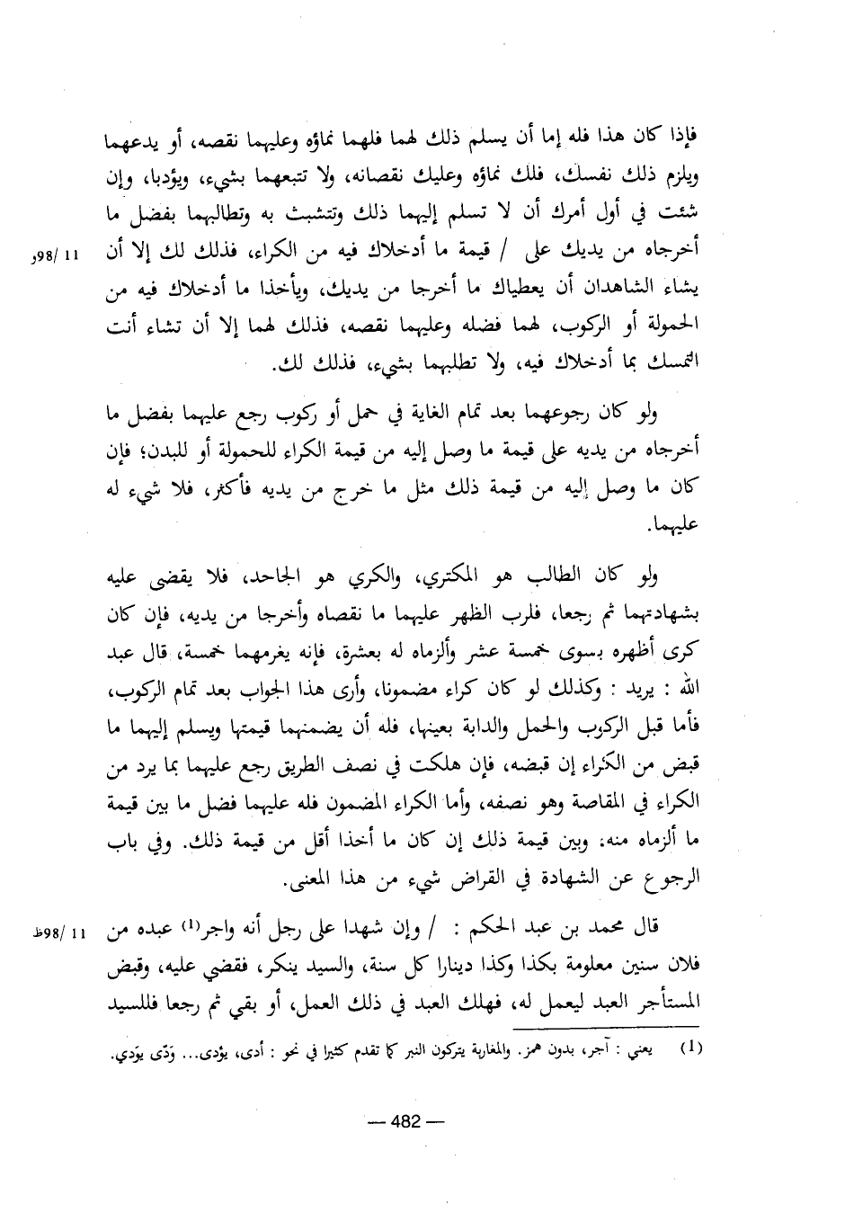 فإذا كان هذا فله إما أن يسلم ذلك لهما فلهما نماؤه وعليهما نقصه، أو يدعهما ويلزم ذلك نفسك، فلك نماؤه وعليك نقصانه، ولا تتبعها بشيء، ويؤدبا، وإن شئت في أول أمرك أن لا تسلم إليهما ذلك وتتشبث به وتطالبهما بفضل ما أخرجاه من يديك على / قيمة ما أدخلاك فيه من الكراء، فذلك لك إلا أن يشاء الشاهدان أن يعطياك ما أخرجا من يديك، ويأخذا ما أدخلاك فيه من الحمولة أو الركوب، لهما فضله وعليهما نقصه، فذلك لهما إلا أن تشاء أنت التمسك بما أدخلاك فيه، ولا تطلبهما بشيء، فذلك لك.