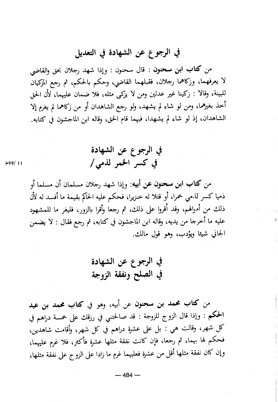 من كتاب محمد بن سحنون عن أبيه، وهو في كتاب محمد بن عبد الحكم: وإذا قال الزوج للزوجة: قد صالحتني في رزقك على خمسة دراهم في كل شهر، وقالت هي: بل على عشرة دراهم في كل شهر، وأقامت شاهدين، فحكم لها بهما، ثم رجعا، فإن كانت نفقة مثلها عشرة فأكثر، فلا غرم عليهما، وإن كان نفقة مثلها أقل من عشرة فعليهما غرم ما زادا على الزوج على نفقة مثلها، [8/ 484]