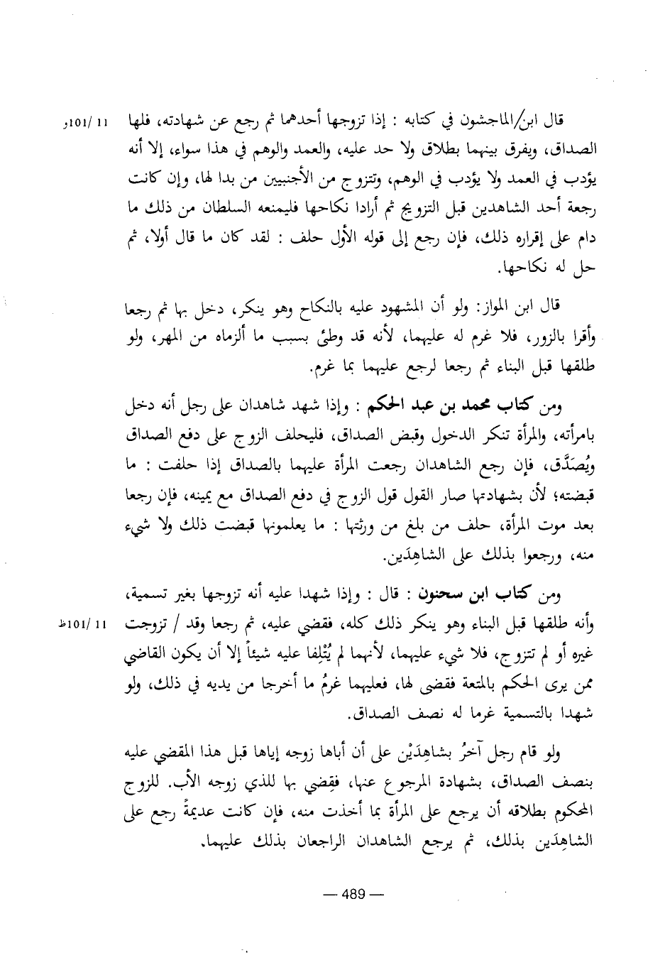 ومن كتاب ابن سحنون: قال: وإذا شهدا عليه أنه تزوجها بغير تسمية، وأنه طلقها قبل البناء وهو ينكر ذلك كله، فقضي عليه، ثم رجعا وقد / تزوجت غيره أو لم تتزوج، فلا شيء عليهما، لأنهما لم يتلفا عليه شيئا إلا أن يكون القاضي ممن يرى الحكم بالمتعة فقضى لها، فعليهما غرم ما أخرجا من يديه في ذلك، ولو شهدا بالتسمية غرما له نصف الصداق.