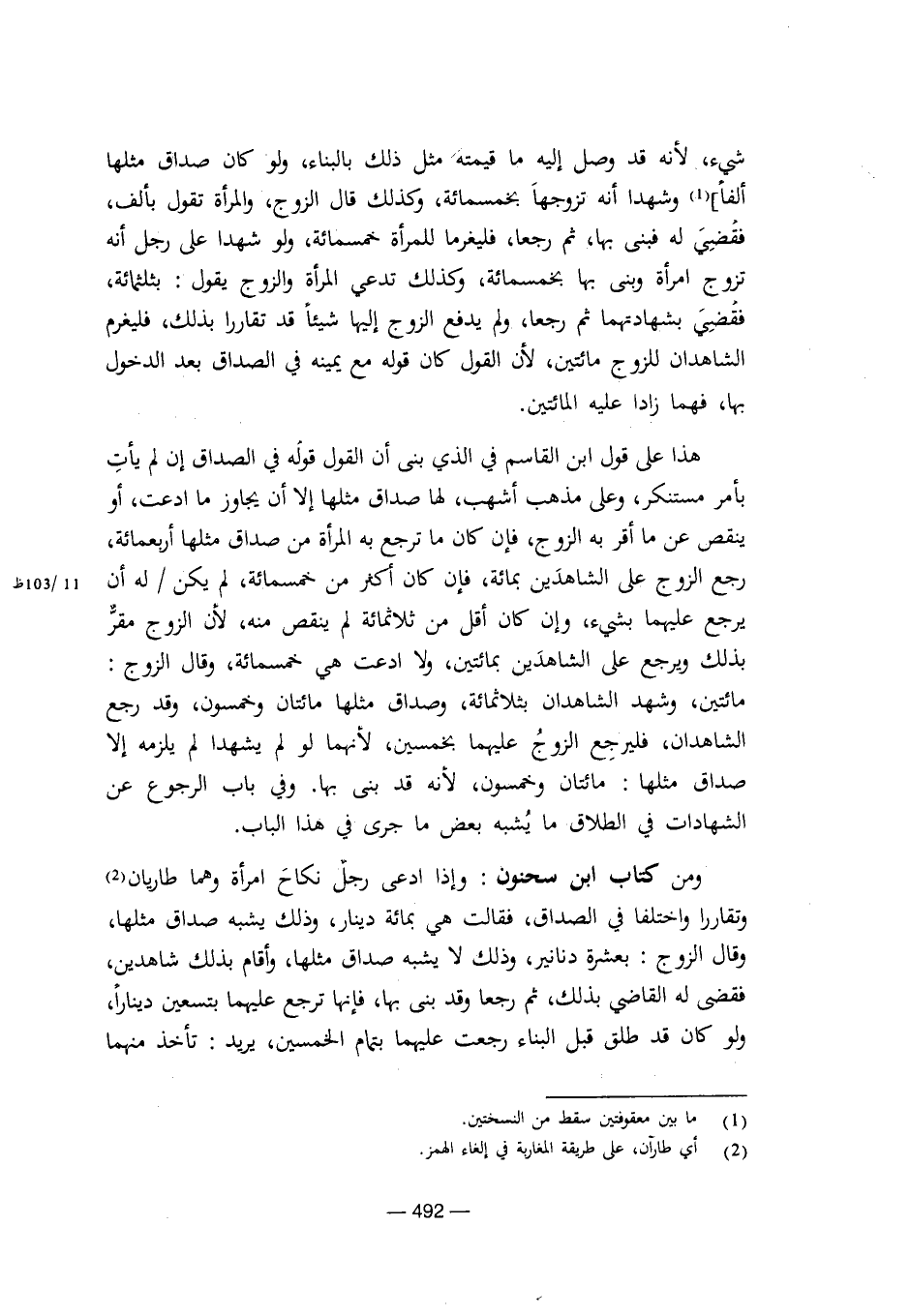 ومن كتاب ابن سحنون: وإذا ادعى رجل نكاح امرأة وهما طاريان وتقاررا واختلفا في الصداق، فقالت هي بمائة دينار، وذلك يشبه صداق مثلها، وقال الزوج: بعشرة دنانير، وذلك لا يشبه صداق مثلها، وأقام بذلك شاهدين، فقضى له القاضي بذلك، ثم رجعا وقد بنى بها، فإنها ترجع عليهما بتسعين ديناراً، ولو كان قد طلق قبل البناء رجعت عليهما بتمام الخمسين، يريد: تأخذ منهما [8/ 492]