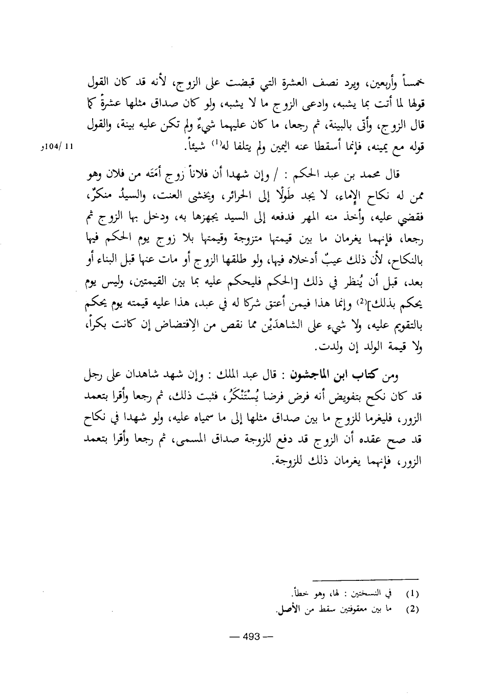 قال محمد بن عبد الحكم: / وإن شهدا أن فلانا زوج أمته من فلان وهو ممن له نكاح الإماء، لا يجد طولا إلى الحرائر، ويخشى العنت، والسيد منكر، فقضي عليه، وأخذ منه المهر فدفعه إلى السيد يجهزها به، ودخل بها الزوج ثم رجعا، فإنهما يغرمان ما بين قيمتها متزوجه وقيمتها بلا زوج يوم الحكم فيها بالنكاح، لأن ذلك عيب أدخلاه فيها، ولو طلقها الزوج أو مات عنها قبل البناء أو بعده، قبل أن ينظر في ذلك [الحكم فليحكم عليه بما بين القيمتين، وليس يوم يحكم بذلك] وإنما هذا فيمن أعتق شركا له في عبد، هذا عليه قيمته يوم يحكم بالتقويم عليه، ولا شيء على الشاهدين مما نقص من الافتضاض إن كانت بكراً، ولا قيمة الولد إن ولدت.