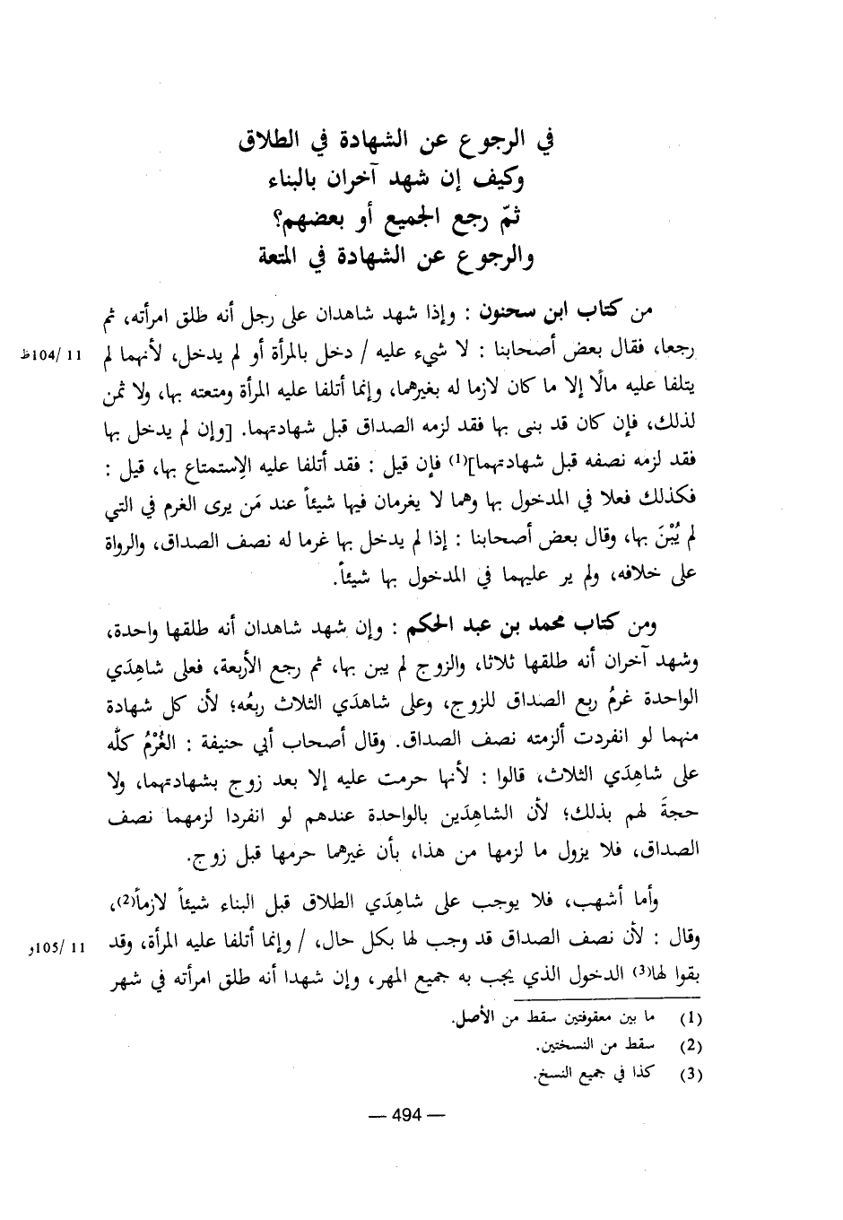 من كتا ابن سحنون: وإذا شهد شاهدان على رجل أنه طلق امرأته، ثم رجعا، فقال بعض أصحابنا: لا شيء عليه/ دخل بالمرأة أو لم يدخل، لأنهما لم يتلفا عليه مالا إلا ما كان لازما له بغيرهما، وإنما أتلفا عليه المرأة ومتعته بها، ولا ثمن لذلك، فإن كان قد بنى بها فقد لزمه الصداق قبل شهادتهما. [وإن لم يدخل بها فقد لزمه نصفه قبل شهادتهما] فإن قيل: فقد أتلفا عليه الاستمتاع بها، قيل: فكذلك فعلا في المدخول بها وهما لا يغرمان فيها شيئا عند من يرى الغرم في التي لم يبن بها، وقال بعض أصحابنا: إذا لم يدخل بها غرما له نصف الصداق، والرواة على خلافه، ولم يرد عليهما في المدخول بها شيئا.